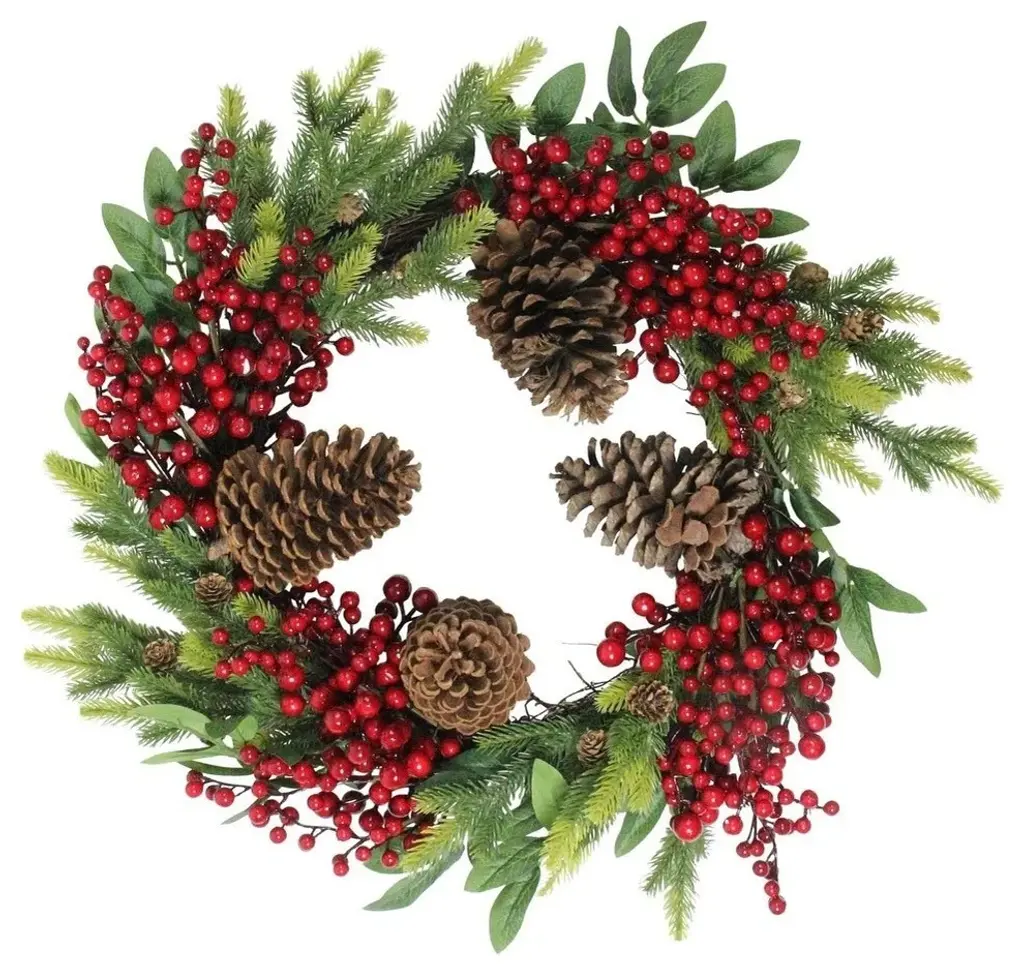 The vivid green magnolia leaves of this artificial wreath are topped with red berries and pine which make this ornament look more lively. With an appearance that looks professionally arranged, it will become your favorite home or office decoration for any occasion or season! During the holidays, you can accent it with incandescent lights or place it in front of a large mirror as a fun decoration piece.