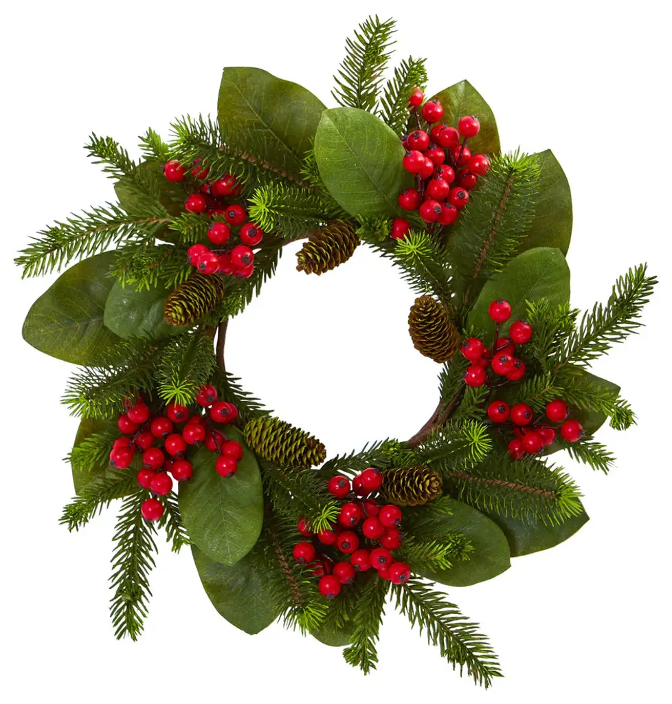 Nearly Natural 24ï¿1⁄2 Magnolia Leaf, Berry And Pine Artificial Wreath