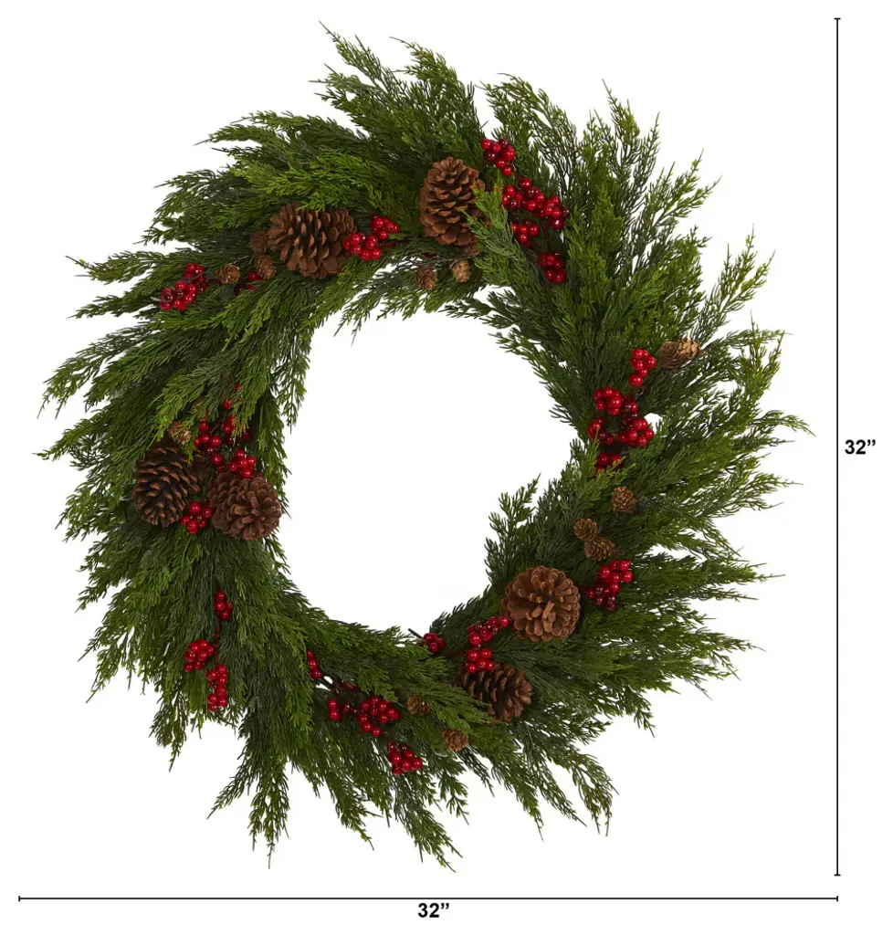 Update your traditional decor accents and add some curb appeal to your home or office entrance with the beauty provided by this artificial wreath intricately designed from realistic looking cypress evergreens, carefully accented throughout with sprays of bright red holly berries and faux pinecones, all of which looks incredibly realistic. Perfect for wall and/or door display in either a home or office environment, this traditional 32� (in circumference) decorative wreath makes for an inviting accent and can undoubtedly help inject front-door appeal all throughout the holiday season.