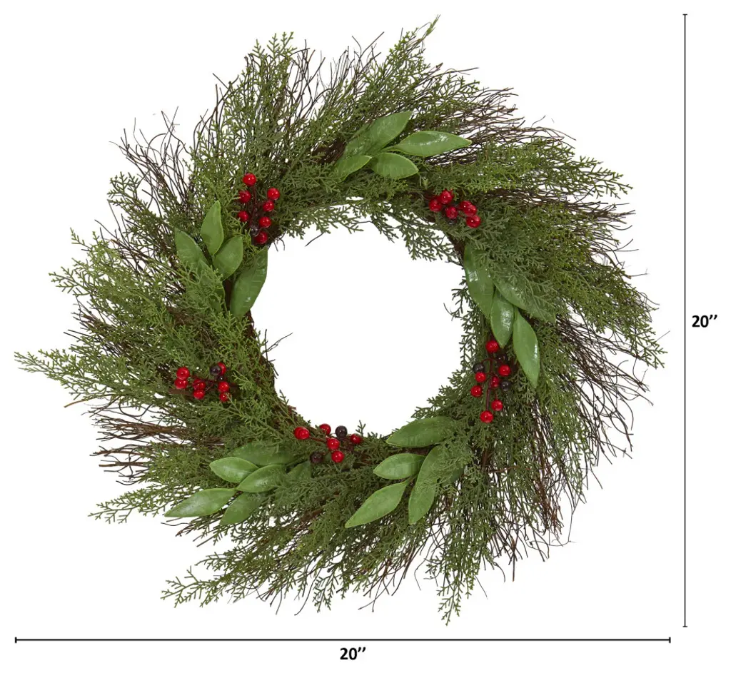 Spruce up the entrances to your home or office with this seasonal-inspired artificial wreath consisting of realistic-looking cedar and ruscus foliage in a palette of year-round greens, handsomely accented throughout with bright red holly berries. Measuring 20 around, this silk wreath would make a fine holiday gift.