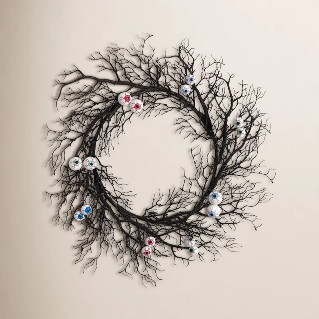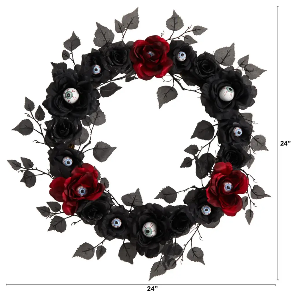 Keep a wondering eye throughout Halloween with this spooky eyeballs wreath. Blue and green eyeballs are nestled in between red and black flowers for an edgy look that''ll satisfy even the pickiest Halloween enthusiasts. Be different and bold. With a dimension of 24" house in any area that needs an extra pair of eyes. Add to a bare wall or door. 24 Eyeball Rose Halloween Artificial Wreath