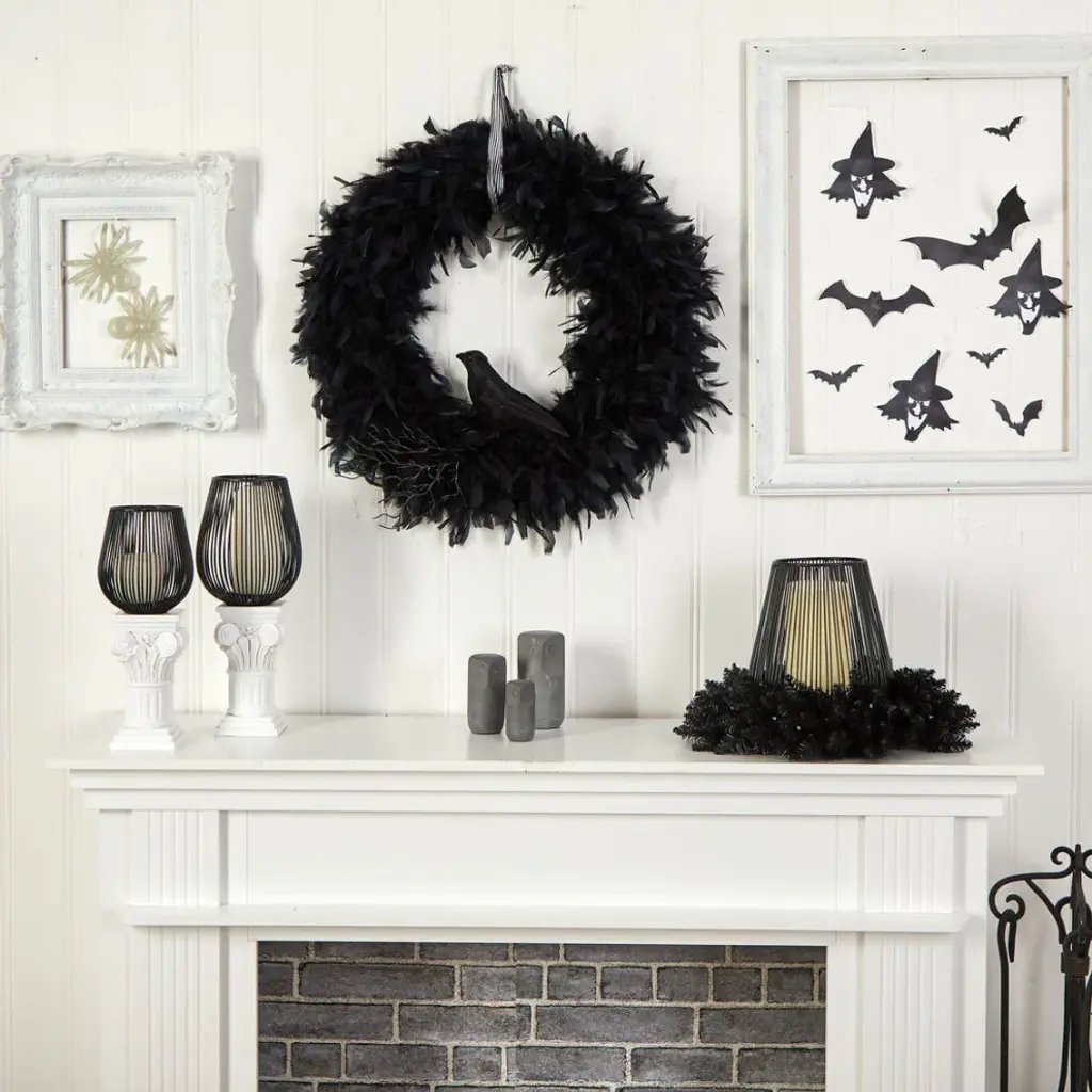 Have a dark Halloween this season with the Feathered Halloween Wreath with Decorative Raven. If you''re looking to display mystery and intrigue, or just a fan of the color black, display the raven proudly to scare the goblins and ghosts. We guarantee this will be a crowd-pleaser and conversation starter. With a diameter of 30" hang in any door or wall. Get spooky every Halloween season 30" Halloween Raven Feather Wreath