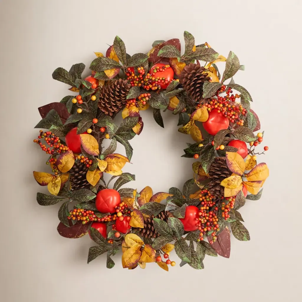 When you think of the perfect autumn landscape, the picturesque fall foliage is top of mind. Now you can craft your own spectacular scenery with this Maple Leaf artificial wreath. Inspired by the North American forests, this wreath comes with naturally occurring details and vibrant shades of variegated perfectly, imperfect leaves mimicking the fall foliage and accented by pinecones and berries. With a dimension of 24, showcase mother natures beauty during the Thanksgiving dinner table, Halloween or cozy nights. Perfect for a family fun DIY fall design session. 24 Autumn Maple Leaf and Berries Fall Artificial Wreath
