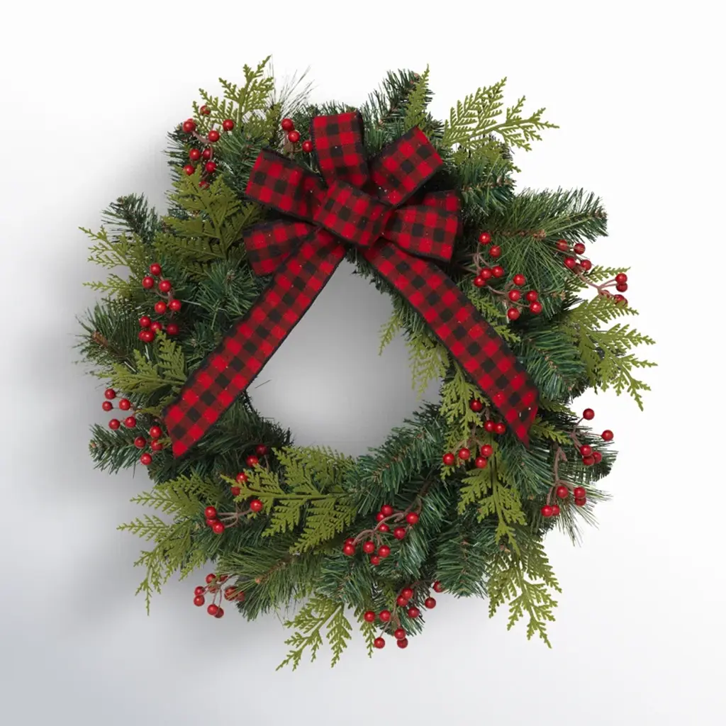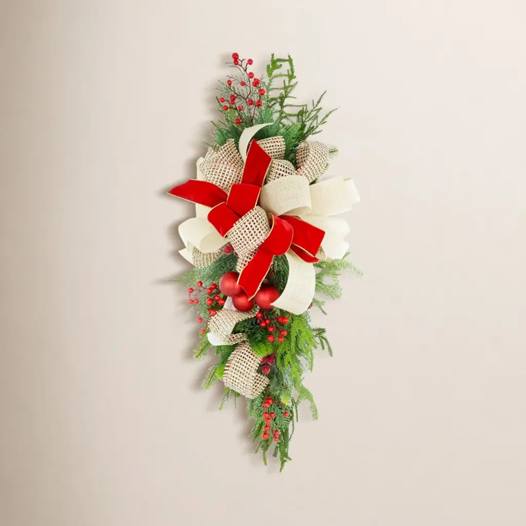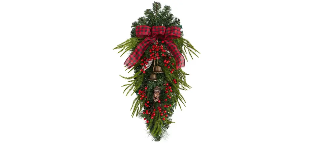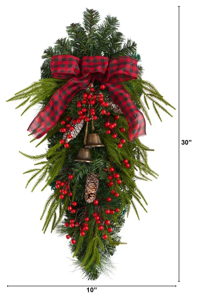 Make your traditional Christmas dreams come true with this Christmas artificial teardrop. Full of rich colored evergreens and accented by pinecones and berries, two small bells hang from the checkered bow at the center. Crafted from high-quality materials, display in an area in need of some Christmas cheer. With a height of 30", house in any bare wall or door. It makes a fine gift as well. 24 Holiday Christmas Pine Cones, Berry and Bells Wreath