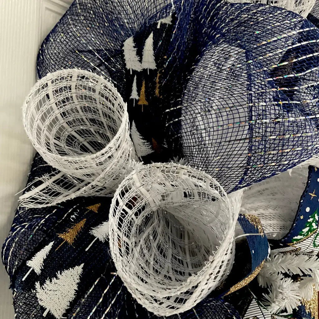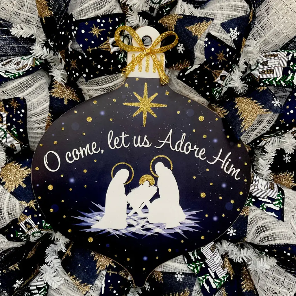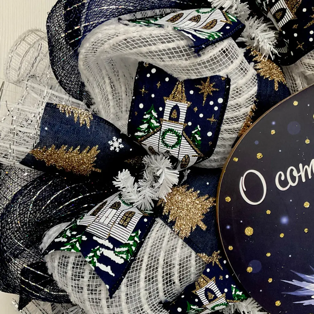 Large, Premium, Full Handmade Deco Mesh Inspirational Christmas wreath. Large wooden ornament shaped accent with the wording "Oh Come Let Us Adore Him" rests on a bed of pure white snow deco mesh Glittering gold is placed on the accent to highlight stars and halos. The sign displays Mary, Joseph and infant Jesus along with the Star of Bethlehem. A gold bow is placed above the sign. Beautiful premium blue ribbons with churches and Winter Tree ribbons surround the inner ring. The outer ring is made of navy blue deco mesh with silver stripes and has white and silver windowpane flutes and white tree ribbons. Size is large, 24 inch diameter and inch depth.