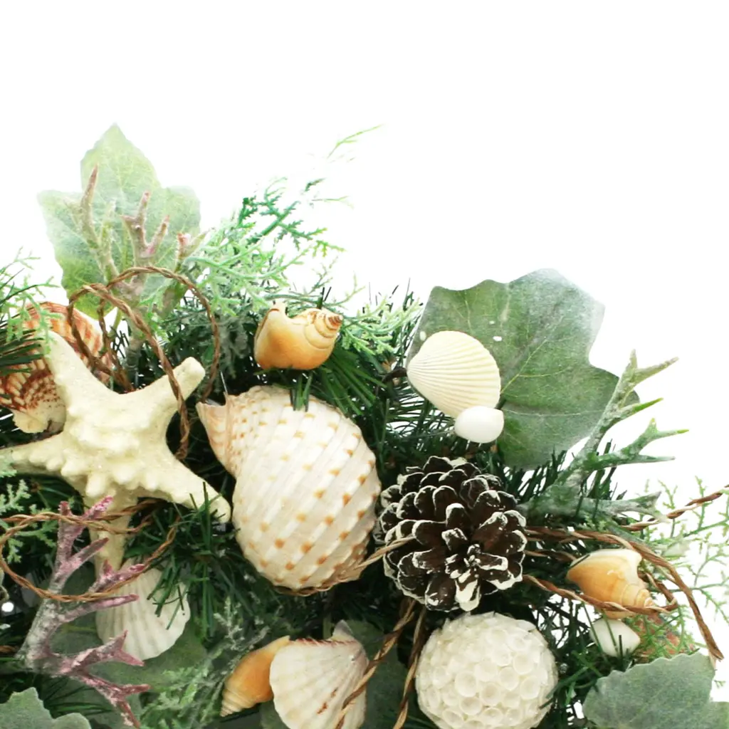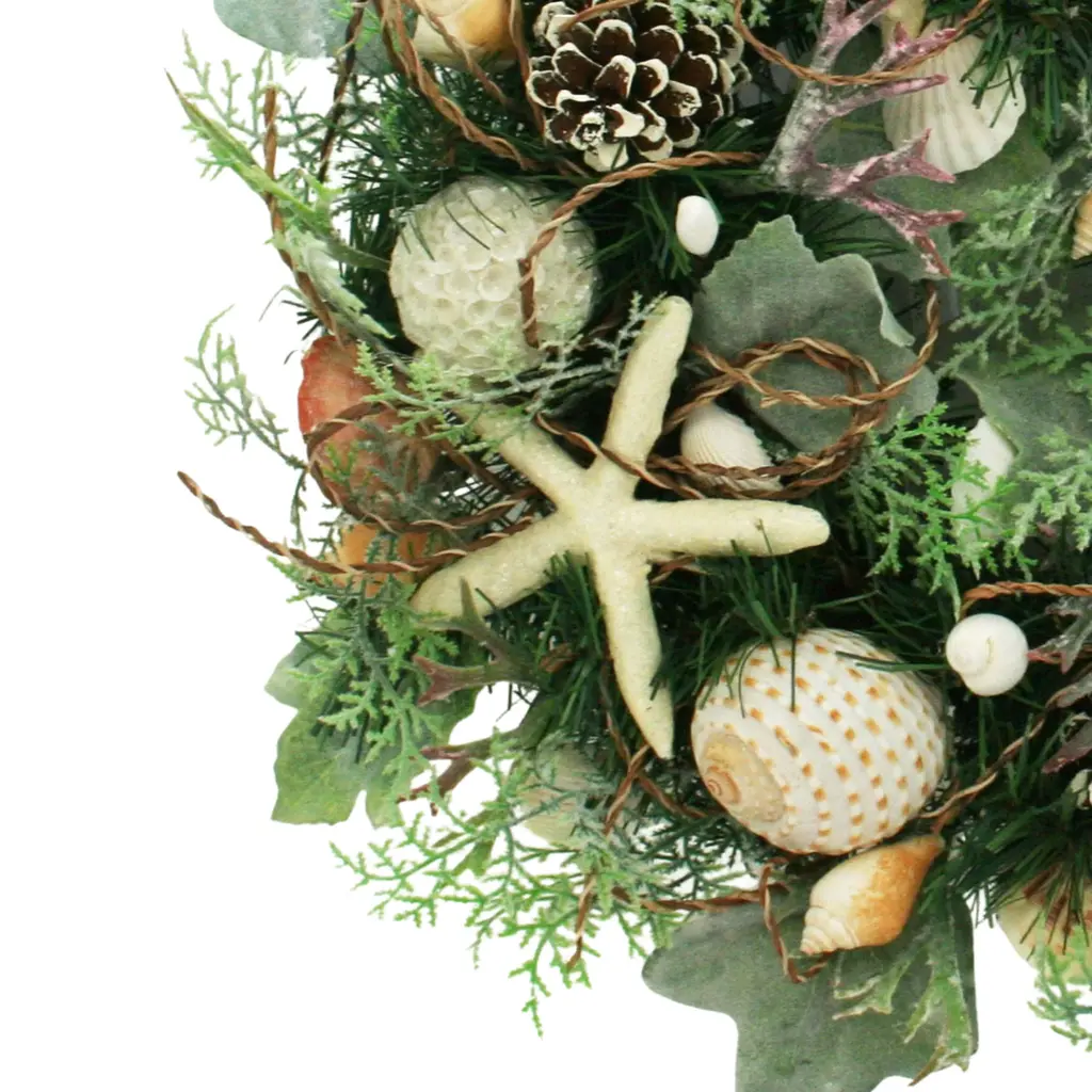 Invite the calm of the coast into your home with this handcrafted wreath, where natural textures meet seaside elegance. Real shells - each with their own soft ivory and neutral tones - are thoughtfully arranged among layers of rich green foliage, creating a balanced blend of ocean elements and organic charm. The circular form evokes the rhythm of the tides, while the earthy palette adds warmth and tranquility to any space.