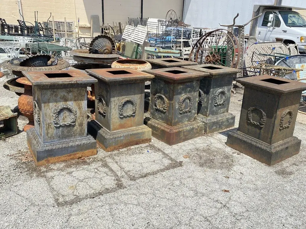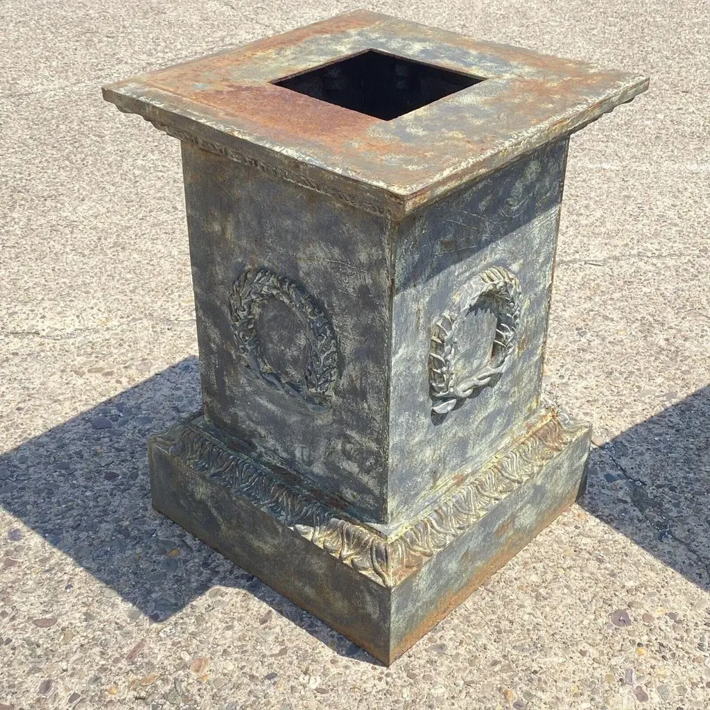 Pair of Large Neoclassical Style Cast Iron Wreath Green Garden Urn Pedestal Base. Item features a heavy cast iron construction, large impressive size, wreath design on all four sides, attractive weathered/distressed finish, weight approx 240 lbs each. Listing is for pedestal bases only and does not include urn top. Circa Late 20th Century. Measurements: 34" H x 25" W x 25" D. *Price is per pair. 2 Pair available. More cast iron garden pieces available as seen in example image*
