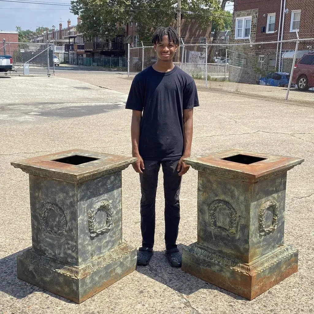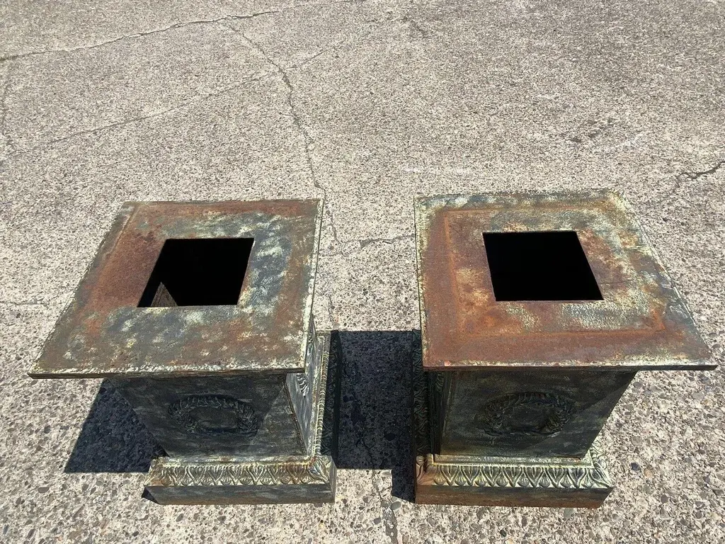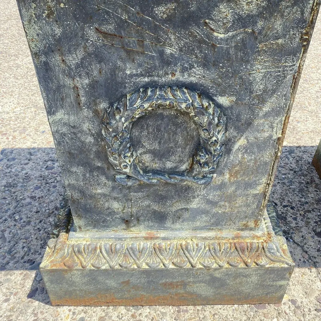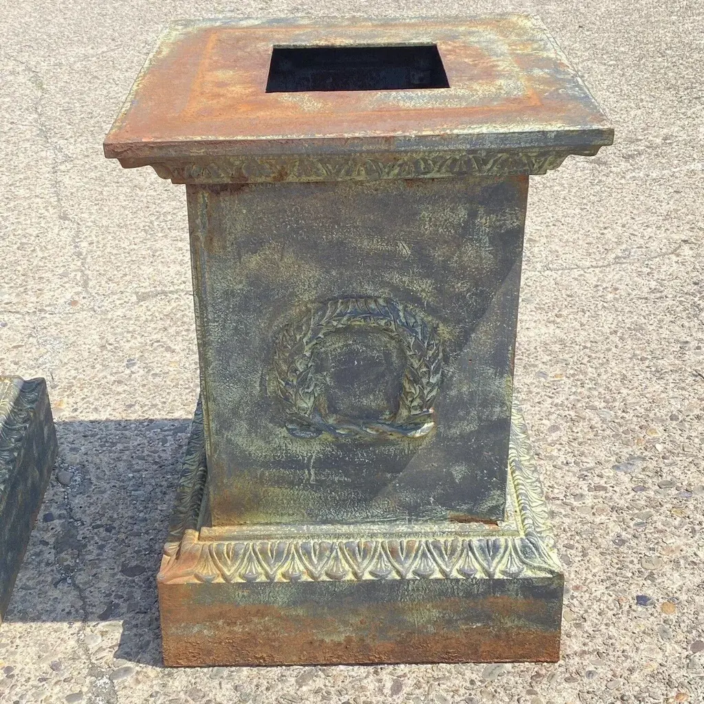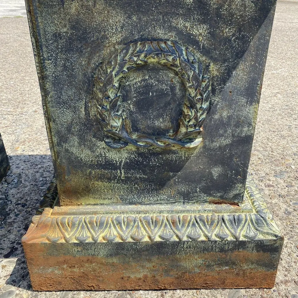 Pair Large Neoclassical Style Cast Iron Wreath Green Garden Urn Pedestal Base