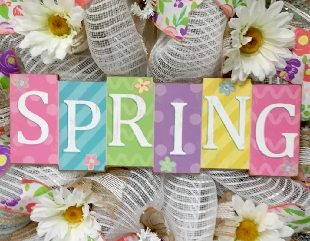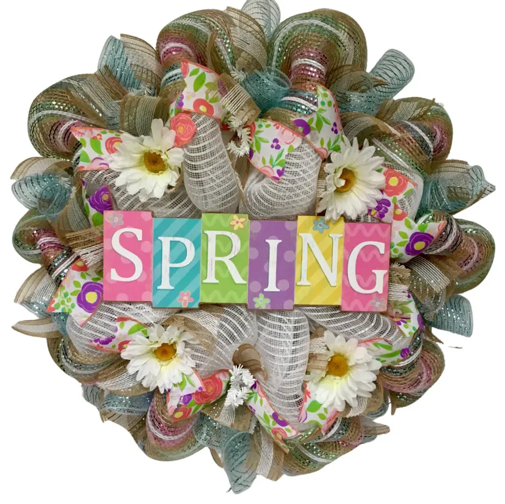 Beautiful, full, handmade deco mesh Spring or Easter Wreath. A large, colorful, pastel, sign rests on a bed of striped white deco mesh. The sign spells SPRING. Beautiful floral ribbons and burlap/ white mesh ribbons surround the sign. The inner ring has beautiful white daisies. The outer ring is made of burlap with pastel metallic stripes. Light blue metallic flutes and burlap/white mesh ribbons surround the exterior. Perfect for Easter or Spring. The size is 24 inches in diameter and 6 inches deep
