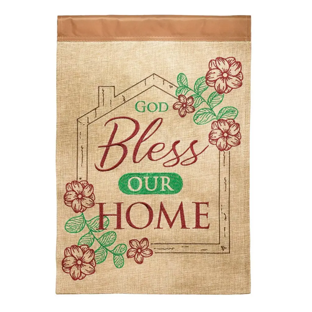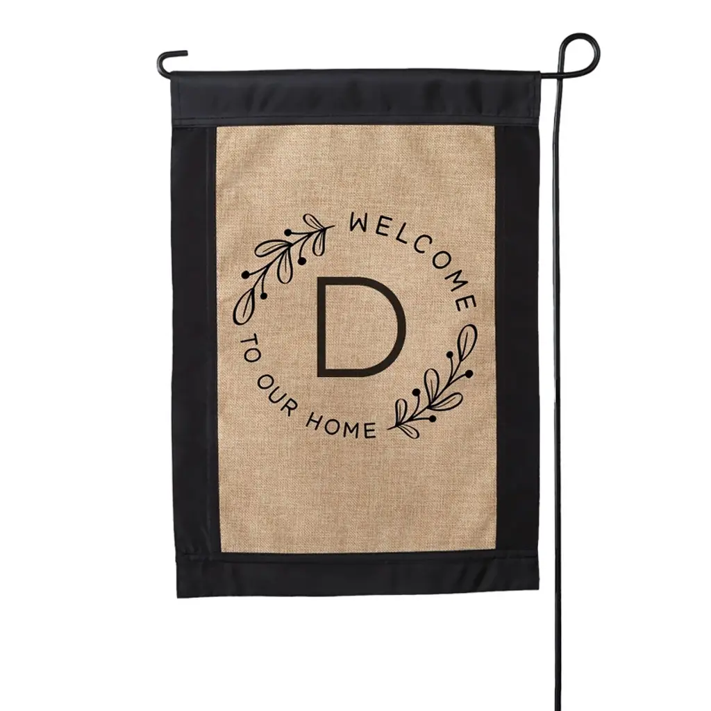 Create a welcoming walk up to your home with the Welcome To Our Home Initial Burlap Garden Flag. The charming design of vines surrounding your family initial will invite guests and friends while adding a personalized flair to your outdoor decor. The design and initial are printed on sturdy, natural colored burlap, with a crisp black border.