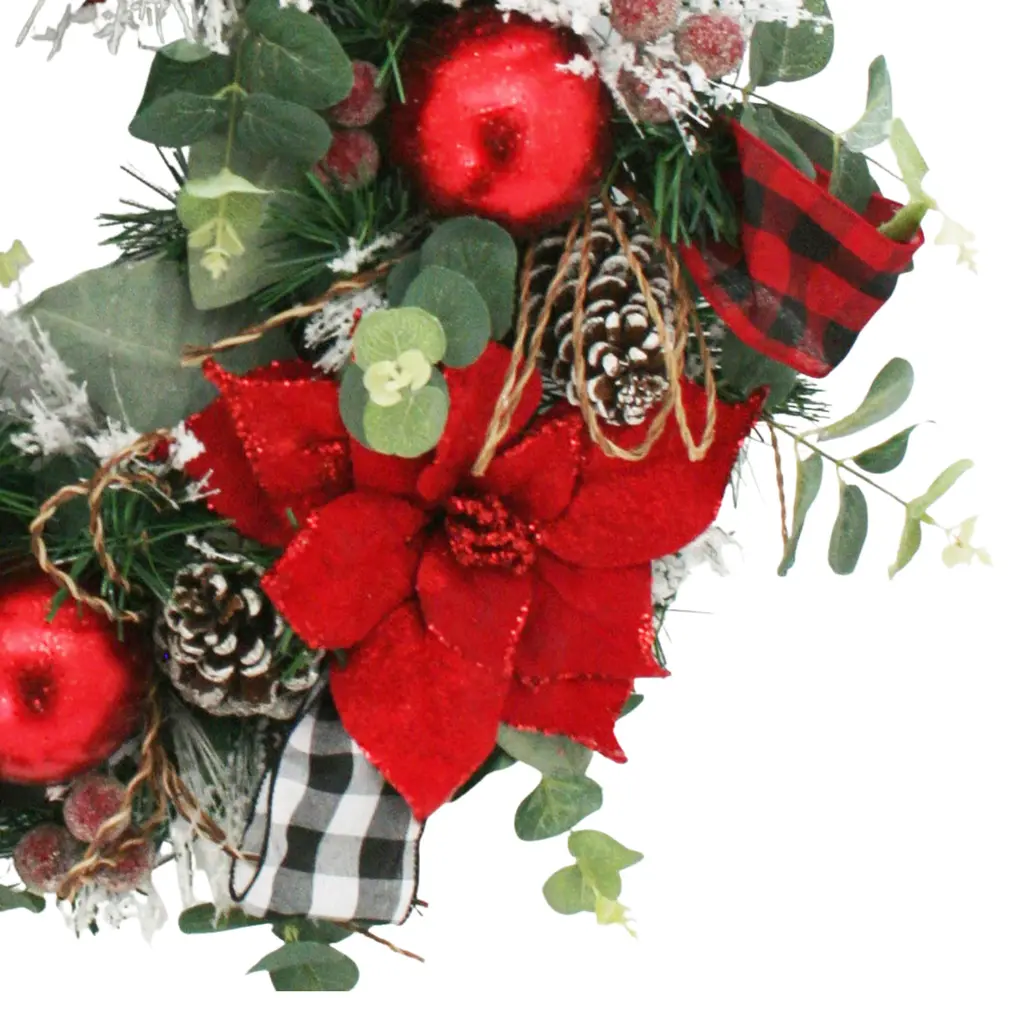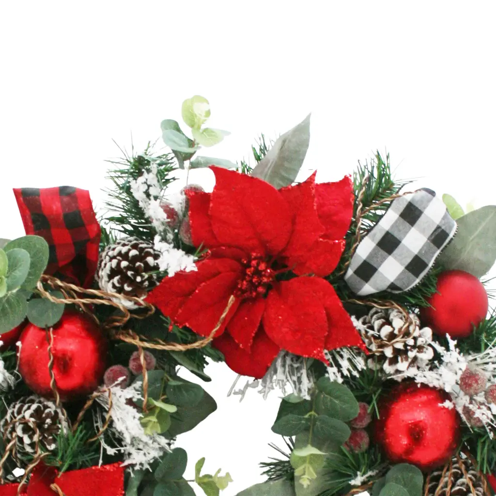 Bold, festive, and full of handcrafted charm, this holiday wreath is a striking celebration of seasonal color and texture. Featuring vibrant red poinsettias as the centerpiece, it's designed to bring warmth and elegance to any door, mantel, or wall.