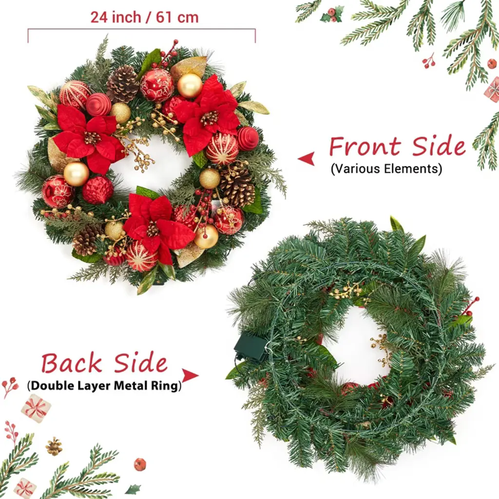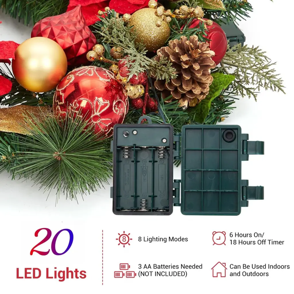 Prelit Christmas Wreath 24 Inch, Battery Operated Lighted Xmas Wreath with Red Gold Balls & Poinsettia for Front Door, Fireplace, Window, Wall DecorProduct DescriptionElevate your holiday d¨¦cor with the 24-Inch Prelit Christmas Wreath, a stunning fusion of traditional elegance and modern functionality. Designed for both indoor and outdoor use, this large wreath features lush PVC pine branches adorned with classic red and gold Christmas balls, pinecones, berries, and lifelike artificial red poinsettia flowers. The built-in 20 LED lights offer 8 lighting modes, from twinkling to steady glow, powered by 3 AA batteries (not included) with an energy-saving 6-hour on/18-hour off timer. Perfect for front doors, fireplaces, windows, or walls, this wreath combines durability, beauty, and convenience to create a captivating focal point for your seasonal celebrations.Key Features Elegant Design Combines PVC pine branches, red and gold Christmas balls, pinecones, berries, and artificial red poinsettia flowers for a classic yet luxurious holiday aesthetic. Battery-Operated LED Lights Features 20 energy-efficient LED lights with 8 lighting modes (twinkle, flashing, steady, etc.). Includes a 6-hour on/18-hour off timer to conserve battery life. Large 24-Inch Diameter Makes a bold statement on front doors, double doorways, garages, or above fireplaces. Its size ensures high visibility and festive impact. Versatile Use Suitable for indoor and outdoor decor: front doors, windows, walls, fireplaces, retail displays, and parties. Durable Construction Made from premium PVC, fade-resistant materials, and realistic botanicals (poinsettias, pinecones) designed to withstand seasonal use. Specifications Brand: TruAIR Color: Red Gold Material: PVC, Artificial Poinsettia, Pinecones Dimensions: 5.5"D x 24"W x 24"H Weight: 3 Pounds Light Source: 20 LED Lights (8 Modes) Power: 3 AA Batteries (Not Included) Timer: 6 Hours On / 18 Hours Off Mounting: Door Hook Included (Easy Hang) Occasion: Christmas, Winter Holidays
