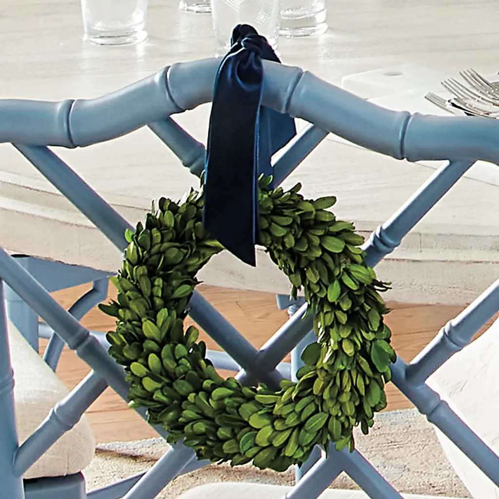 Beautiful green color and natural texture for your windows, chair backs and cabinet fronts. This lush preserved mini boxwood wreath is handmade of real boxwood that's been specially treated to retain its deep green color and soft texture. Preserved Boxwood Mini Wreath features: