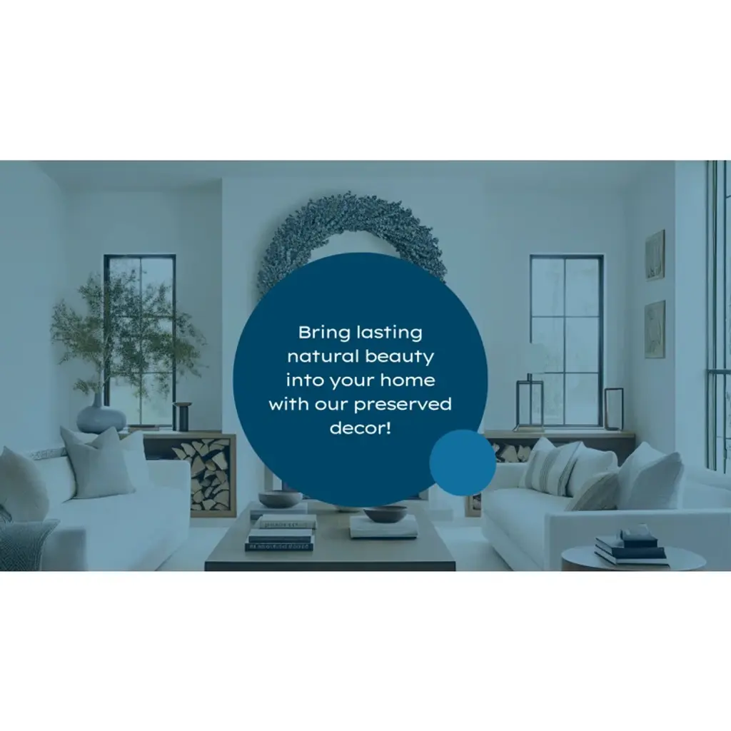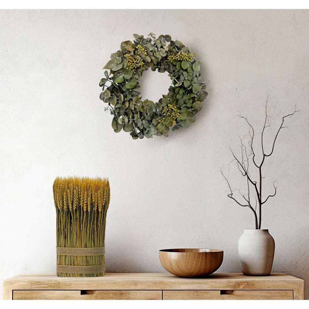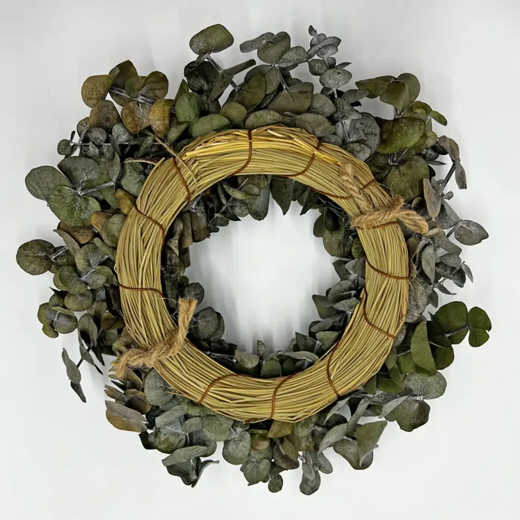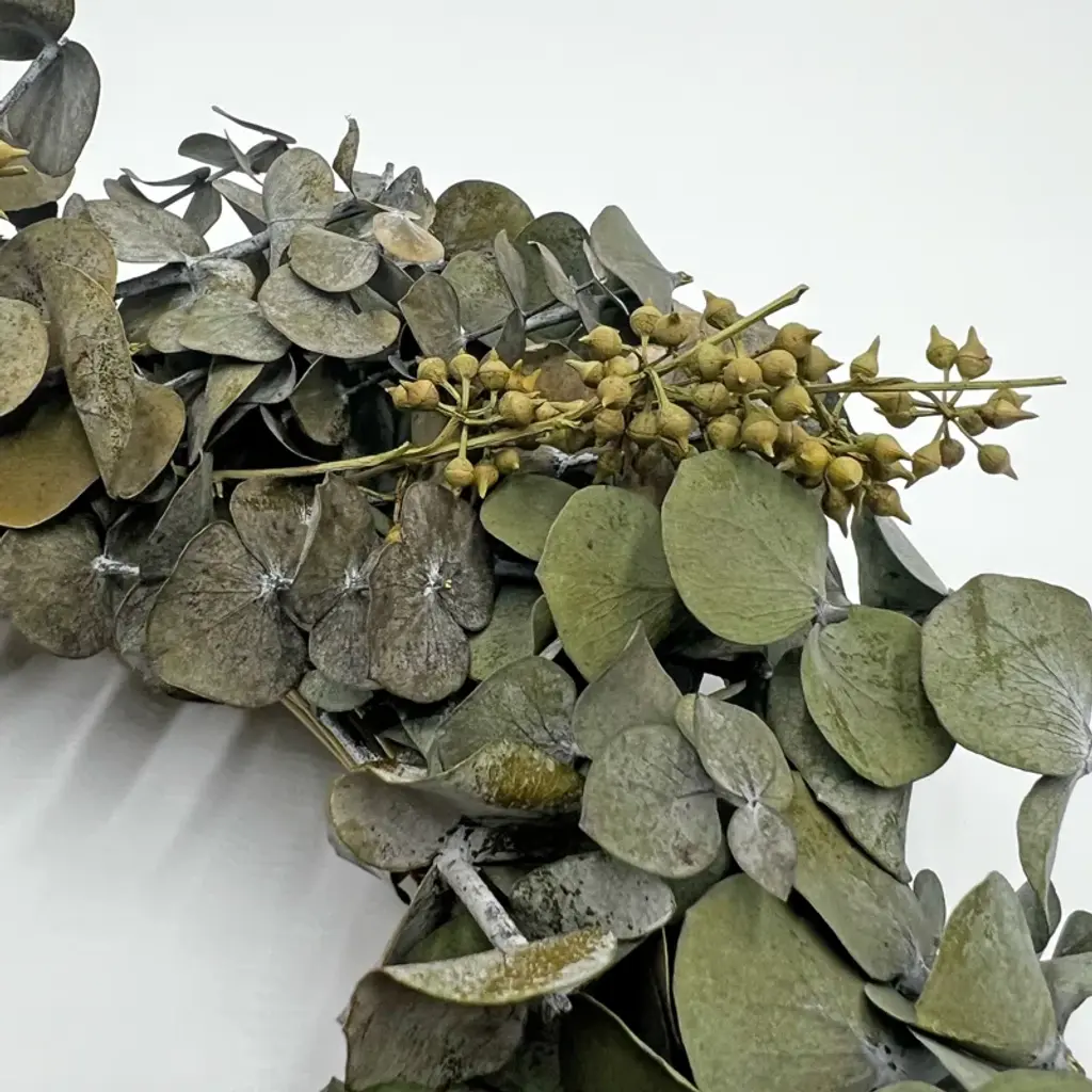 Preserved Eucalyptus Wreath , a real plant that will last and has been dried, making it a timeless addition to your home decor. This wreath combines the classic beauty of preserved Eucalyptus, creating a sophisticated and enduring statement piece. Meticulously crafted, the wreath features preserved Eucalyptus that maintain their lush greenery and natural charm. The preservation process ensures longevity, allowing you to enjoy the rich, evergreen aesthetics of this wreath for an extended period. Includes: One (1) dried real wreath. Leaf and flower material: Eucalyptus. Frame material: Rye straw.