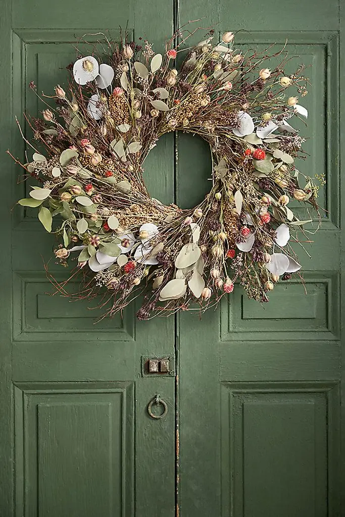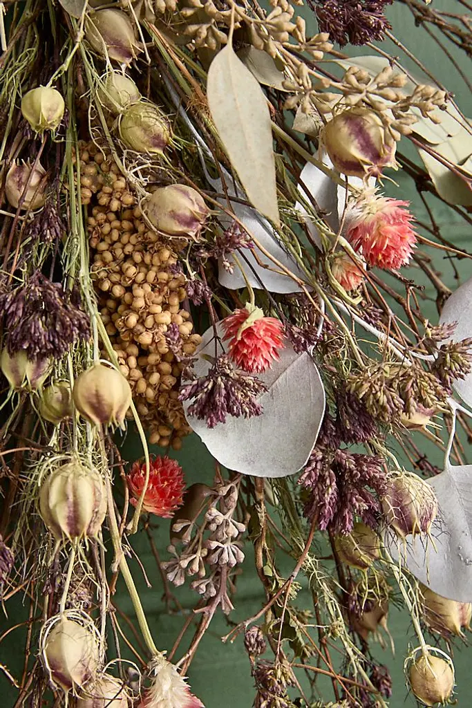 Quail brush twigs, pinto berries, oregano, globe amaranth, silver dollar eucalyptus, nigella, and seed eucalyptus make up this full, natural wreath. Hand-crafted on a woman-owned farm in the Pacific Northwest.
