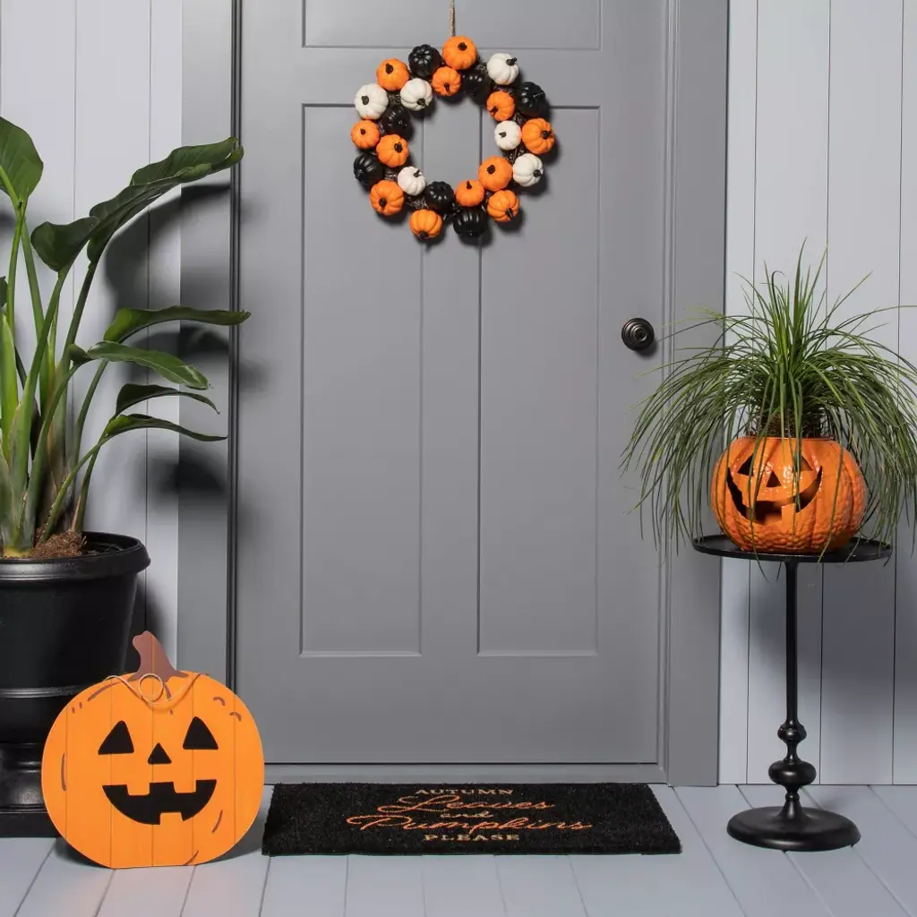 Get your entryway ready for your frightful festivities with this Pumpkins and Black Grass Halloween Wreath from Hyde & EEK! Boutique™. This round artificial wreath is adorned with black, white and yellow pumpkins on black grass to keep your Halloween decor fun and festive. The Halloween wreath also has a lightweight design that makes it easy to hang on any indoor wall. Simply hang it over the fireplace for a fun and festive addition, or put it on your dining table as part of a spooky Halloween centerpiece.