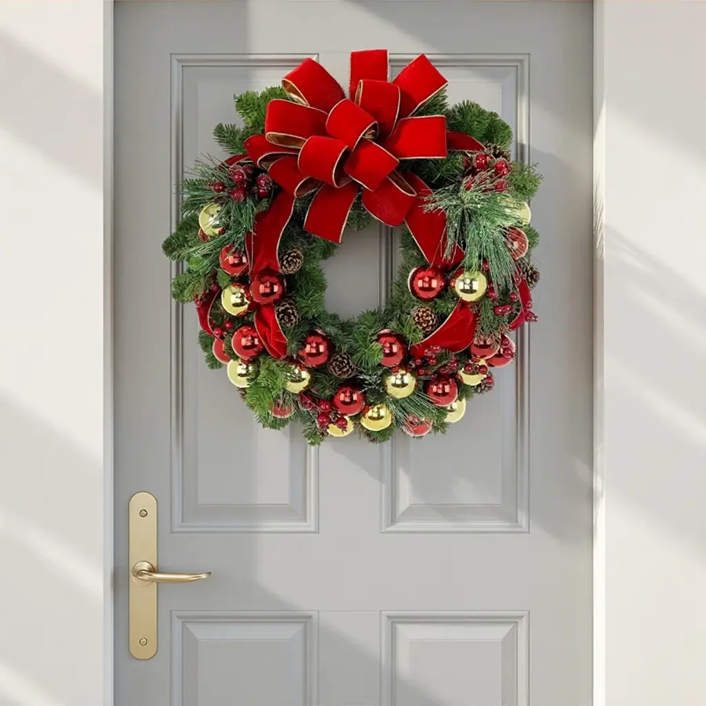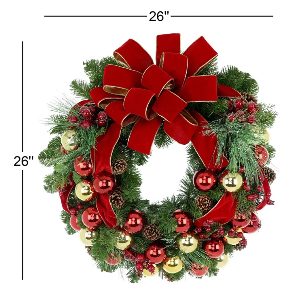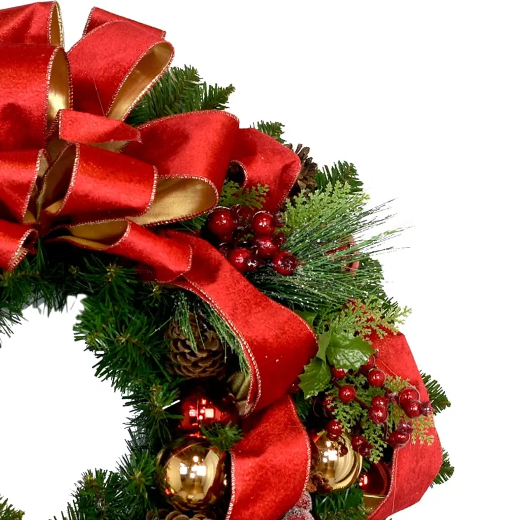A Harry & David Top Holiday Pick. Welcome the holidays into your home with the festive, glamorous look of this handcrafted artificial wreath. Designed with a sprinkling of mixed red berries, natural pine cones, red and gold ornaments, and a big red and gold ribbon, it offers the look of an evergreen wreath without any of the upkeep. That means you don't have to worry about cleaning up those pesky pine needles and you can use it year after year.