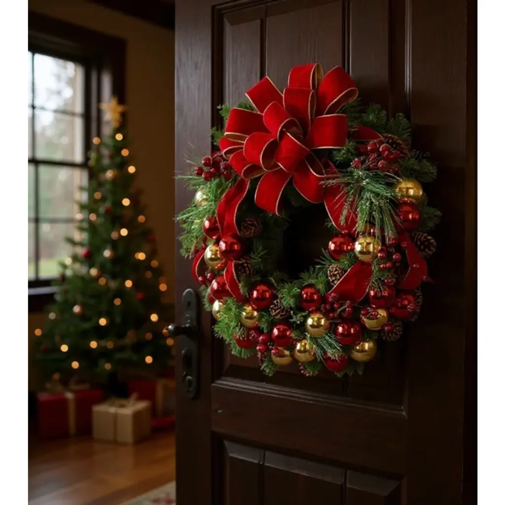 Red And Gold Holiday Wreath With Ornaments And Pine Cones