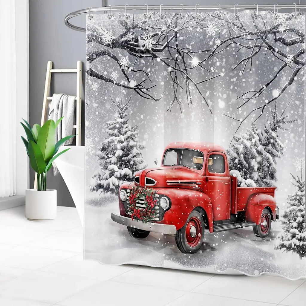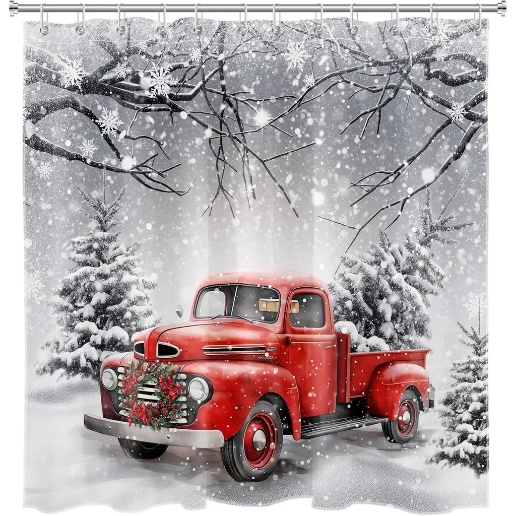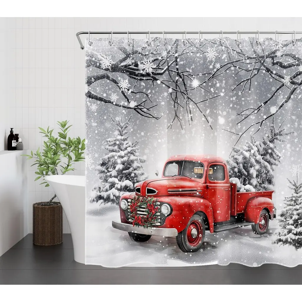 Bring a classic holiday charm to your bathroom with our Red Truck Christmas Shower Curtain, featuring a festive design with a beloved red truck adorned with a wreath and a pine tree. Measuring 72x72 inches, this delightful curtain captures the essence of the season and adds a warm, rustic touch to your decor. Crafted from high-quality, water-resistant fabric, it ensures durability and easy maintenance for everyday use. The vibrant colors and nostalgic imagery create a cozy atmosphere, transforming your bathroom into a winter retreat. Celebrate the magic of Christmas with this charming shower curtain that brings festive spirit to your home!