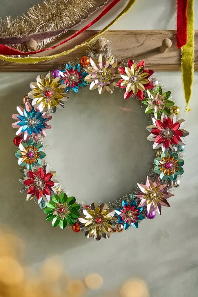Designed especially for terrain, this wreath inspired by vintage light reflectors makes a vibrant addition to your holiday home.