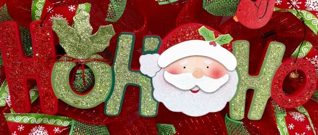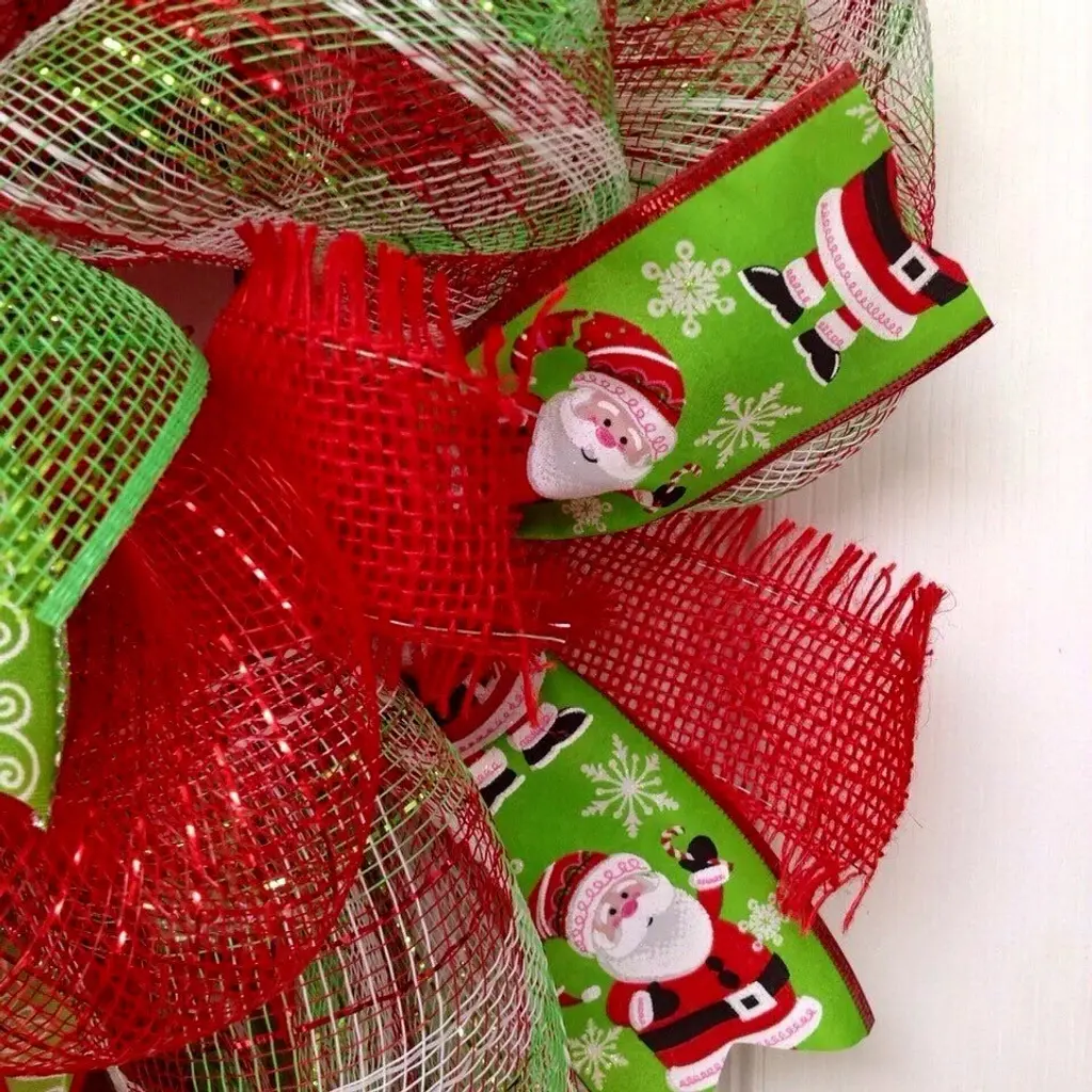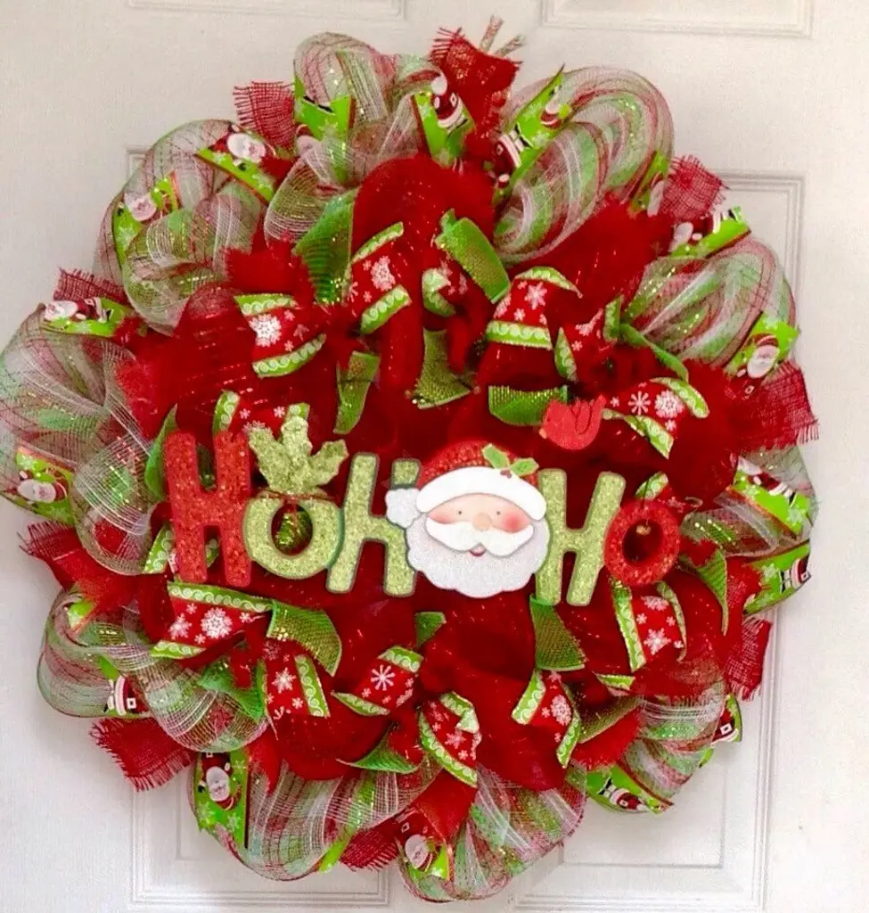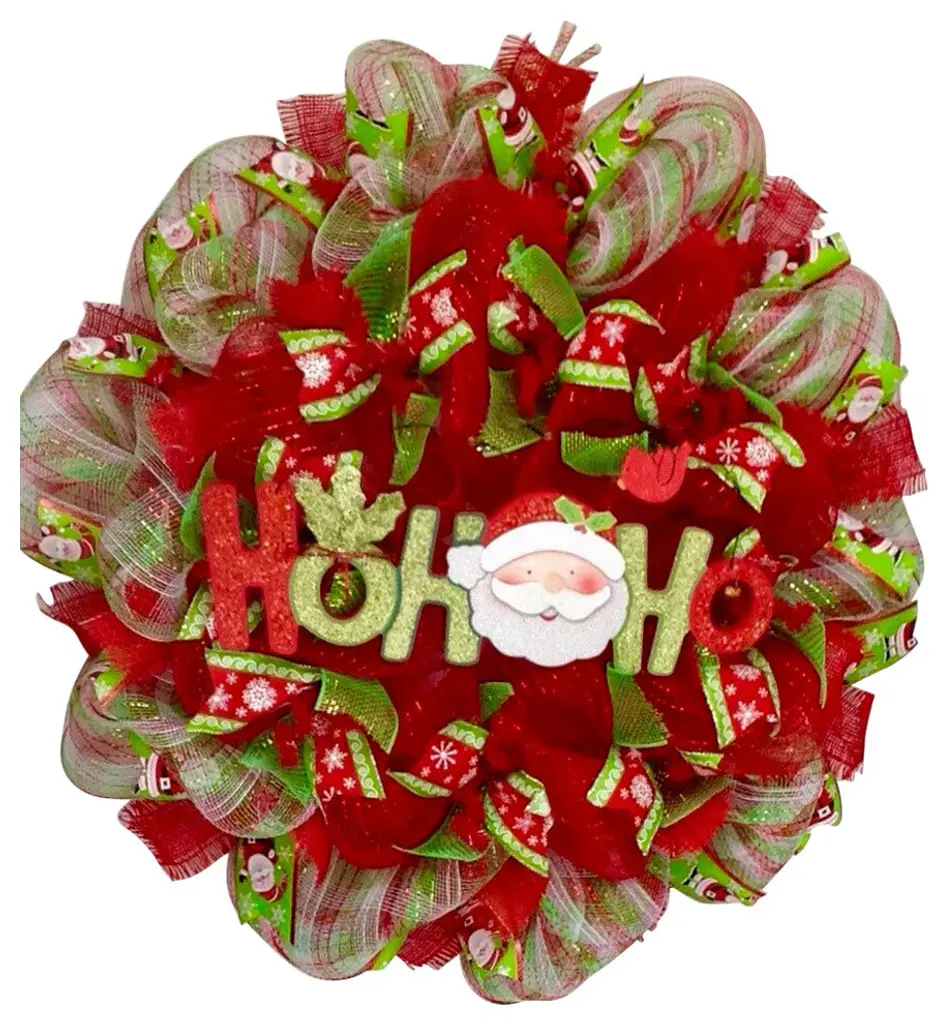 New! Large, Premium, Full Handmade holiday Wreath. The outer ring is made of beautiful, bright red, green and white plaid deco mesh with red burlap frayed ribbons and adorable Santa ribbons. The inner ring is made of metallic red deco mesh with green metallic mesh ribbons and premium snowflake red and green ribbons. A large, glittering Ho Ho Ho sign, decorated with an adorable Santa Claus, rests in the center. Two tiny bells, holly leaves and a red Cardinal decorate this glittering, festive Christmas wreath. Very cheery and colorful! Size is a large 24 inch diameter and 6 inch depth.