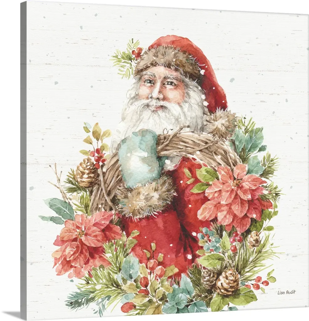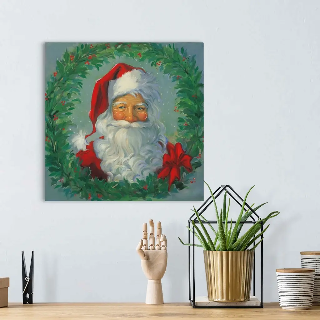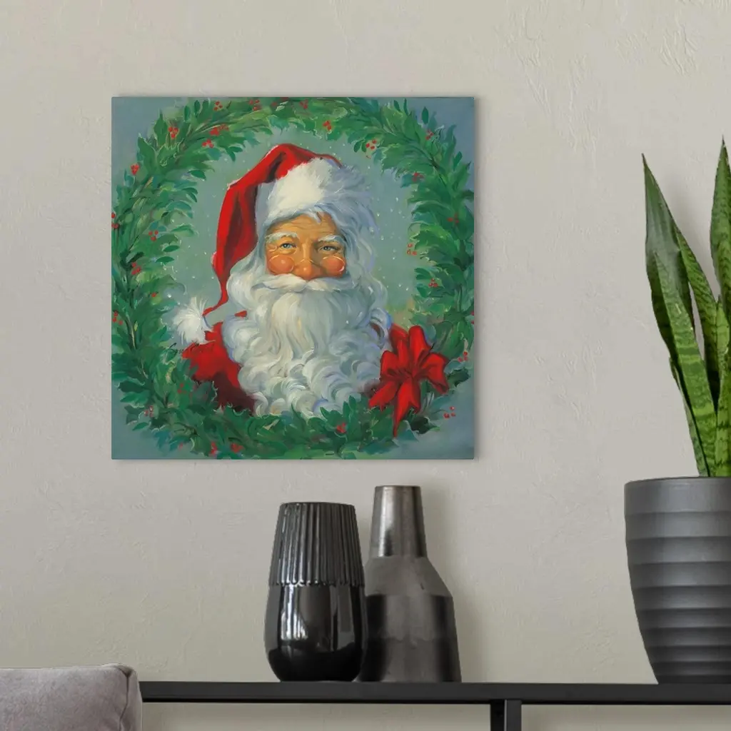Portrait of Santa surrounded by a wreath.