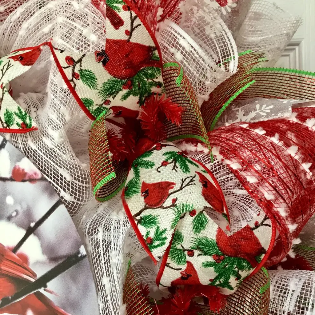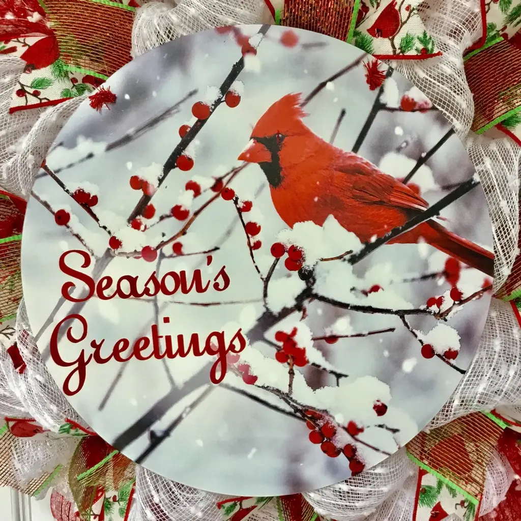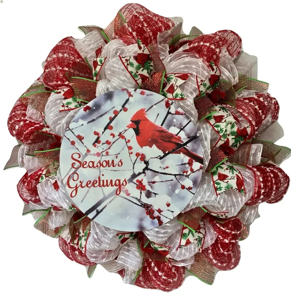New! Large, Premium, Full Handmade Deco Mesh Seasons Greeting Holiday Wreath Handmade Deco Mesh. A beautiful red cardinal, resting on winter, snowy branches with red berries is displayed on a large, round, tin accent. Seasons Greetings is written on the accent which rests on white snow mesh. Gorgeous canvas ribbons with red cardinals and red/green mesh ribbons surround the accent. The outer ring is made of shimmering red mesh with white Swiss dots. White snowball mesh flutes and snowflake ribbons surround the exterior. Red/green mesh ribbons are added for color and fullness. This wreath is perfect for homes, businesses and public buildings. The size is a 24 inch diameter and 6 inch depth.