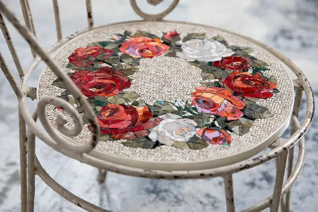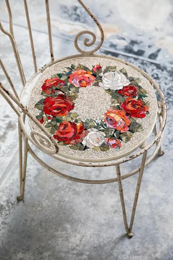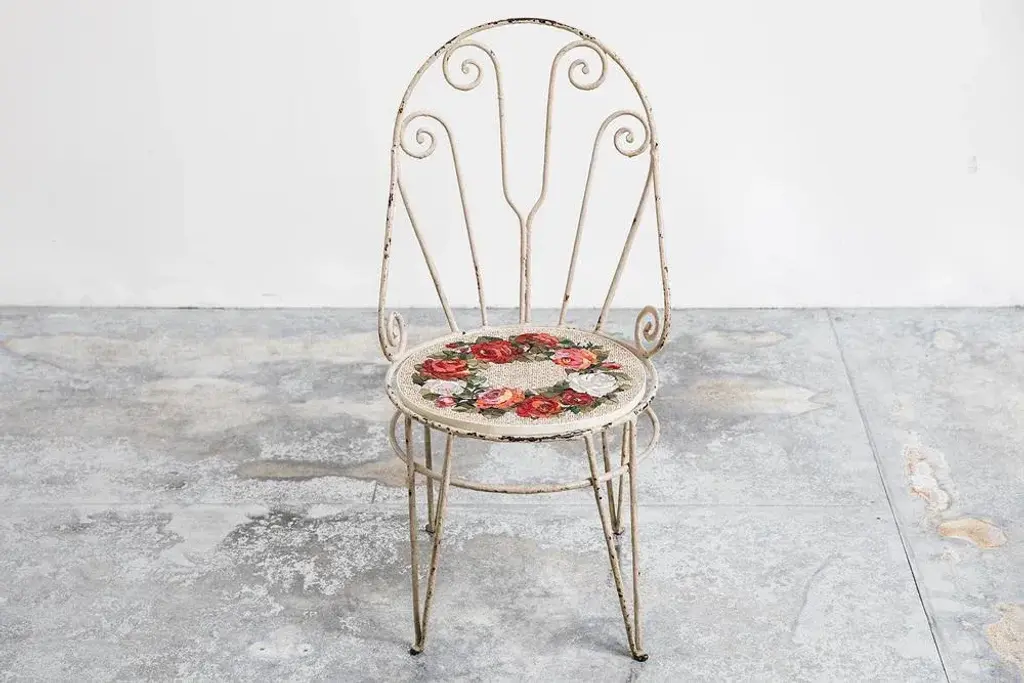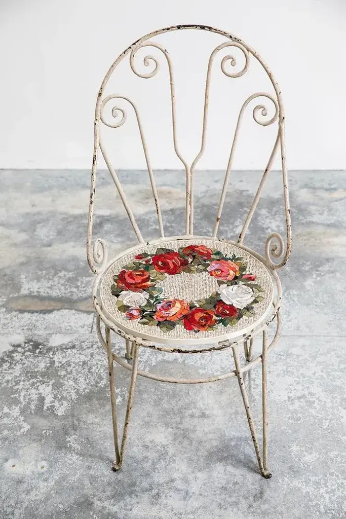 Sedia con wreath antique iron chair by yukiko nagai dimensions: d44 x w43 x h89 cm material: marble, natural stone, venetian color glass, cement, stucco, iron weight: 11 kg “flower patches" is a series derived from the idea of a cross-stitch, or embroidery. Mosaic bouquet — created with marble and flamboyant colors from venetian glass — are applied to carefully selected antique furniture. The mosaics are perfectly integrated with some peculiar features from the antique furniture, while at the same time transform them into something special and cheerful. An antique garden chair, made of cast iron. On the seat there’s a ”stone fabric” mosaic, made with marbles capable of creating a smooth surface, similar to that of a fabric. In the centre, a patches made out of a bouquet of roses recalls the idea of a pillow, resting on the stool that’s inspiring it. *all pieces are handmade, so the colours and shapes of the patterns may vary. * the chair used in this piece is a one-off antique. The price of the artwork may vary depending on the price of the chair. Born in niigata (japan) in 1981, she graduated in environment design at the tama art university. She moved to italy, to study the mosaic at the academy of fine arts in ravenna. The concept behind her body of work, is to reproduce with mosaic the textures of different kinds of material. Through the use of mosaic, she re-enacts the appearance and volume of wood or fabric, briefly deceiving the viewer's eye which, once touched the work, realizes it’s not what it seemed to be. This creates a particular kind of “imbalance” between what the viewers feel and what they see, creating surprise and amusement — the latter being a very important element, that must be present in the work.