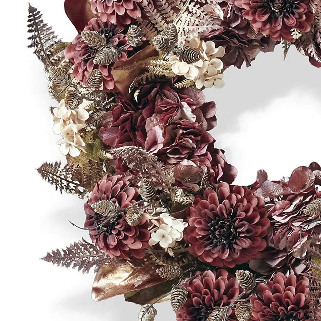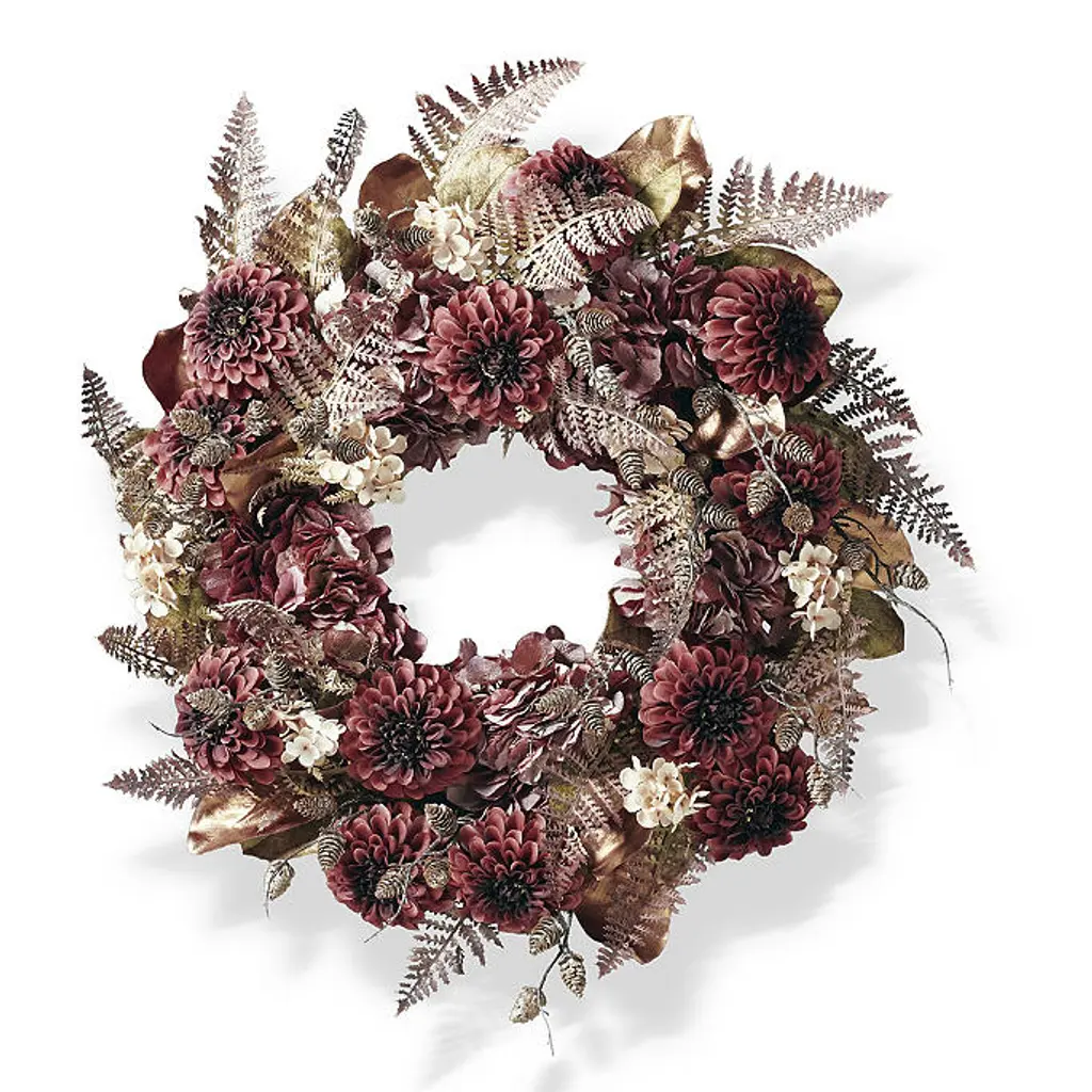 Bring a touch of natural beauty to any space with this wreath full of deep shades of purple, gold magnolia leaves, pinecones stems and ombre fern leaves. Lifelike florals and greenery are arranged to add a vibrant accent to any style. For indoor or covered outdoor use Lifelike faux florals and greenery Twig frame Fluff and shape greenery after unpacking Wipe with a soft, dry cloth Imported A Frontgate exclusive. At Frontgate, our primary focus is quality. We guarantee that every product we sell will stand up to the supreme test – our customers' satisfaction. To learn more about our policies, visit our Shipping & Processing, Returns & Exchanges and Warranty & Price Guarantee pages. Bring a touch of natural beauty to any space with this wreath full of deep shades of purple, gold magnolia leaves, pinecones stems and ombre fern leaves. Lifelike florals and greenery are arranged to add a vibrant accent to any style. For indoor or covered outdoor use Lifelike faux florals and greenery Twig frame Fluff and shape greenery after unpacking Wipe with a soft, dry cloth Imported A Frontgate exclusive. At Frontgate, our primary focus is quality. We guarantee that every product we sell will stand up to the supreme test – our customers' satisfaction. To learn more about our policies, visit our Shipping & Processing, Returns & Exchanges and Warranty & Price Guarantee pages.