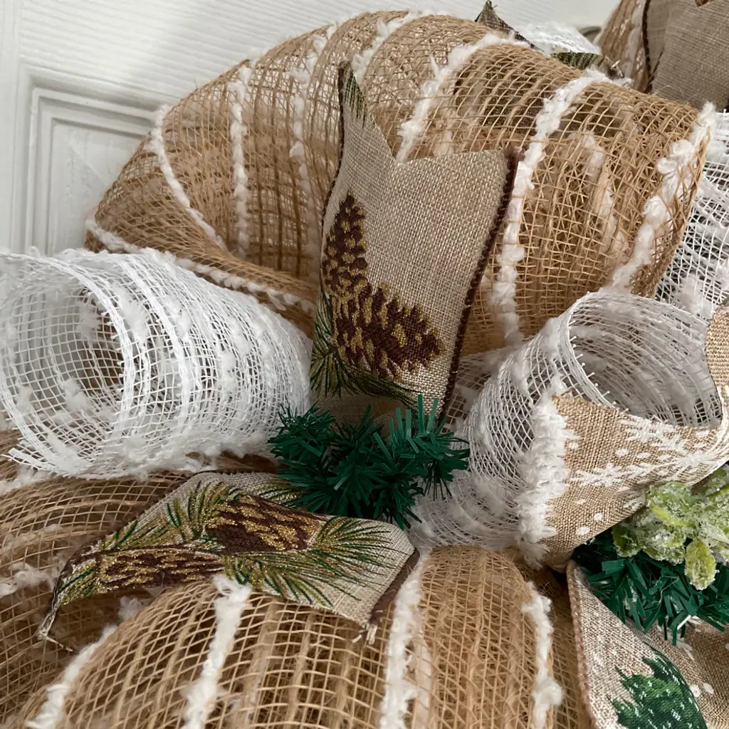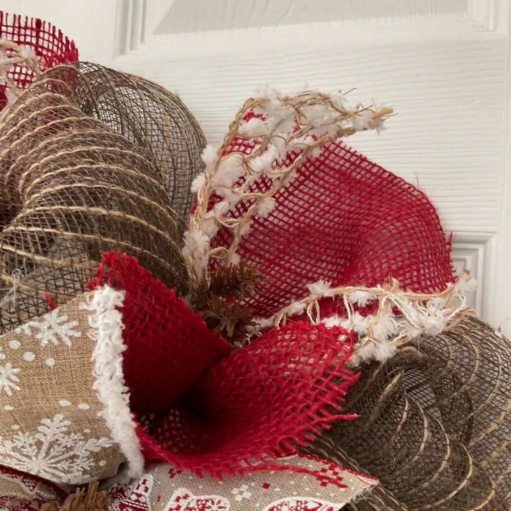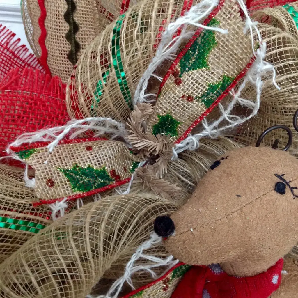 New, full, premium, handmade deco mesh holiday wreath. The outer ring is made of soft, creamy burlap deco mesh with shimmering green and red metallic tinsel stripes. Bright red, frayed burlap ribbons are placed around the exterior. The inner ring is plain creamy deco mesh burlap decorated with gorgeous canvas holly ribbons and placed on white window pane ribbons. Highlighted in the center is an adorable, stuffed, plush Raz reindeer with glittering silver skates and knitted Candy cane leggings. He wears a knitted red scarf with gray polka dots. The reindeer has embroidered swirls on his body and gorgeous metal, antlers! He has holly and berries on his bead. Simply adorable face and very high quality. Limited edition Holiday Premium Deco Mesh Wreath. Exclusively designed by What A Mesh By Diana. Very festive for the holidays and all throughout winter. Size is large, 24 inch diameter and 6 inch depth. Please see photo for size comparison.