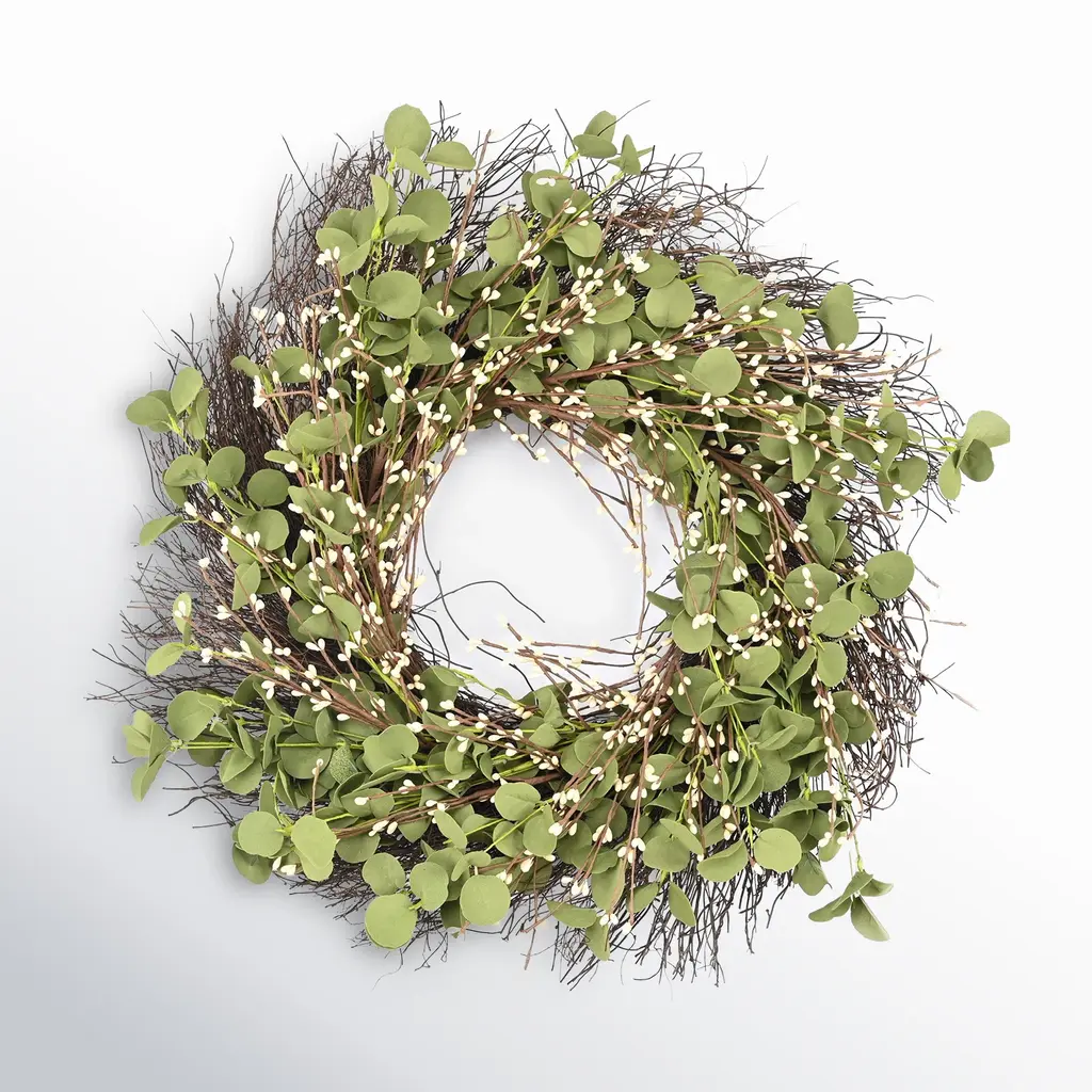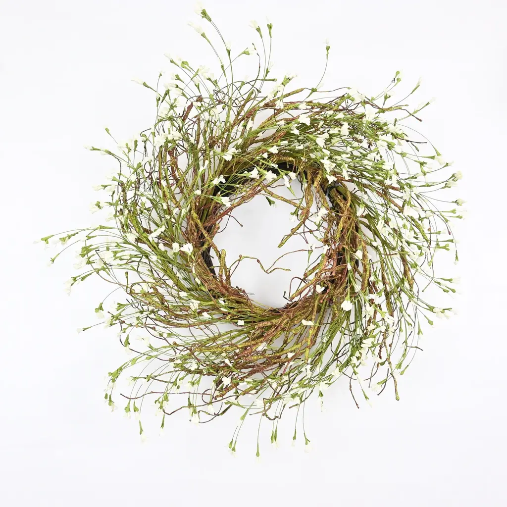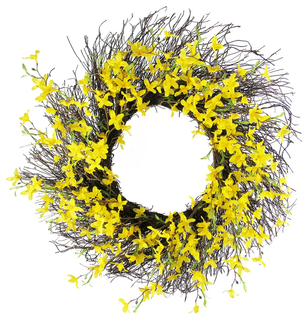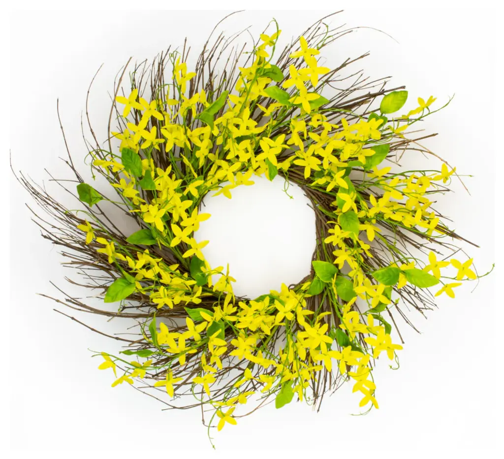 The Star Forsythia Collection is perfect for spring decorating. There are creamy pip berries and vibrant yellow forsythia on a natural twig base. Approximately 20" diameter.