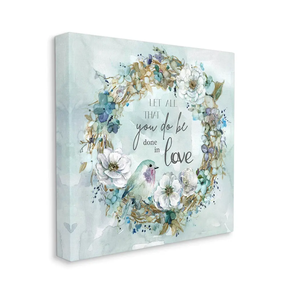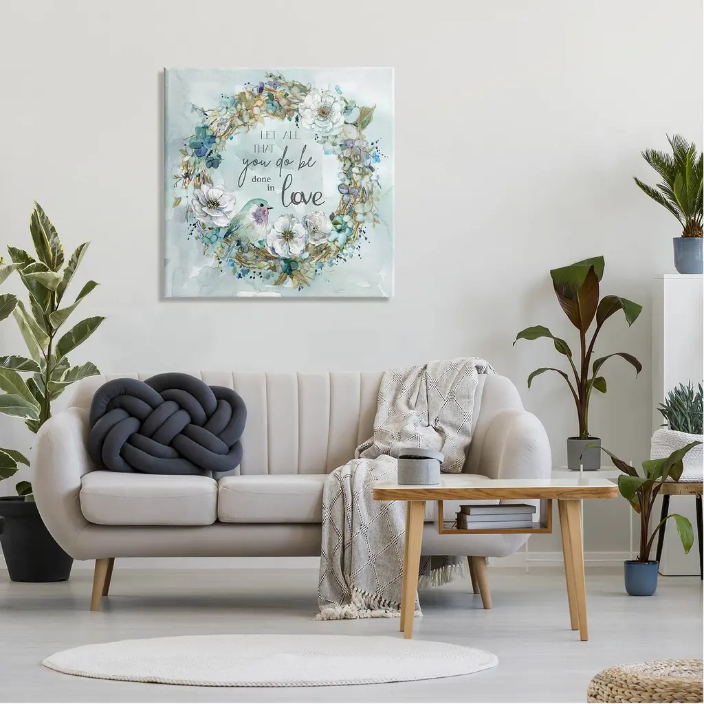 Proudly made in the USA, Our stretched canvas is created with the highest standards. We use only the highest quality inks and canvas on our in house Mimaki printers, and then hand cut and stretch each piece over a 1.5 inch thick wooden frame for hanging. The art comes ready to hang with no installation required.Features: Dimensions: 17 x 1.5 x 17 InchesStretched Canvas Sizes Include Standard: 17 x 1.5 x 17 Large: 24 x 1.5 x 24 X-Large: 30 x 1.5 x 30 Oversized: 36 x 1.5 x 36Wall Art is Ready to Hang - No Installation or Hardware Needed. For Easy Set Up Lean or Layer Artwork on Shelf or Against Wall.Our stretched canvas is created with the highest standards. We use only the highest quality inks and canvas on our in house Mimaki printers, and then hand cut and stretch each piece over a 1.5 inch thick wooden frame for hanging. Made In USA.Artwork Relates To: Bird, Animal, Flower, Plant, Floral, Wreath, Anemone, PetalDesign by Carol RobinsonFirst perfectly in any Living Room, Den, Hallway, Office, Entryway, Study, Dining Room or Bed Room.Text Includes: Let All That You Do Be Done In Love