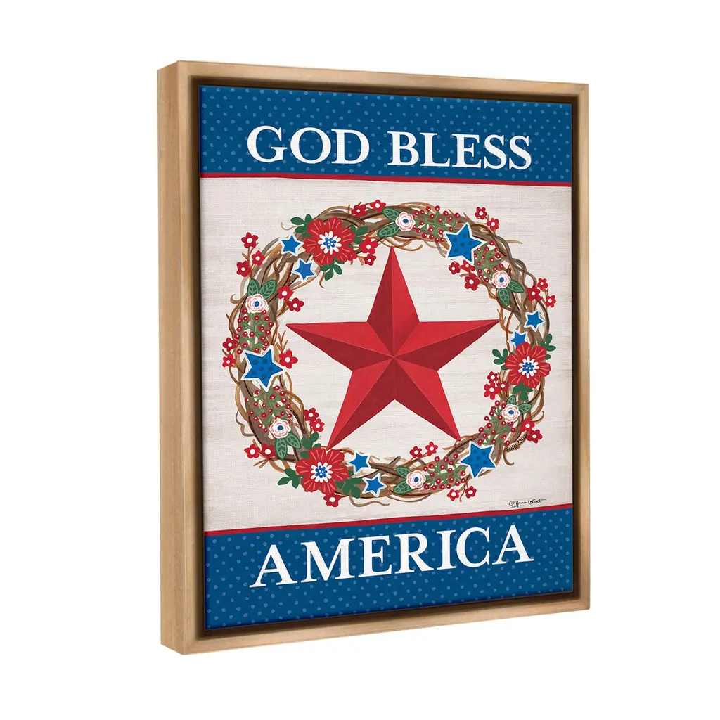 Elevate your home or office to the next level with Stupell Framed Floating Canvas Wall Art. Our premium hand-stretched canvas is mounted securely into a sturdy lightweight frame. The museum-style gap between the wrapped canvas and the box frame gives the illusion of floating artwork. Stupell Wall Art is made in the USA.Features: Dimensions: 17 x 1.7 x 21 Frame, 16 x 1.5 x 20 Canvas ArtFloating Frame Canvas Products are available in sizes 17"x21" and 25"x31". All Floating Frame Canvas Products have a 1.7" Depth.Wall Art is Ready to Hang with Hardware Free Hanging. No Installation required. For Easy Set Up Lean or Layer Artwork on Shelf or Against Wall. Artwork is Permently Fixed into the Frame.Our elevated 1.7" Thick Floating Frame is the perfect complement to our canvas style Wall Art. We use only the highest quality inks in house with industry leading printing solutions. Canvas is hand stretched over a durable wood foundation and then mounted securly into a Modern Box Frame. Made in the USA.Artwork Relates To: Americana, Patriotic, Rustic, Country, Farmhouse, Wreath, Star, Symbol, Flower, Floral, Polka Dot, Pattern, God Bless AmericaDesign by Annie LaPoint