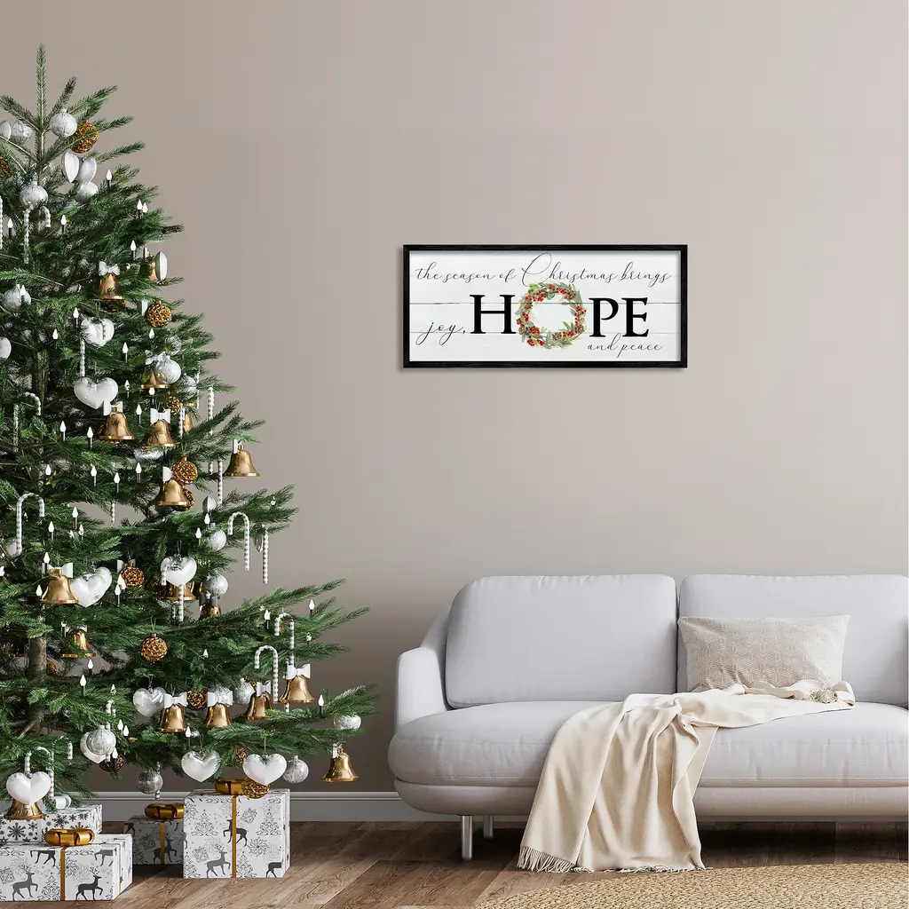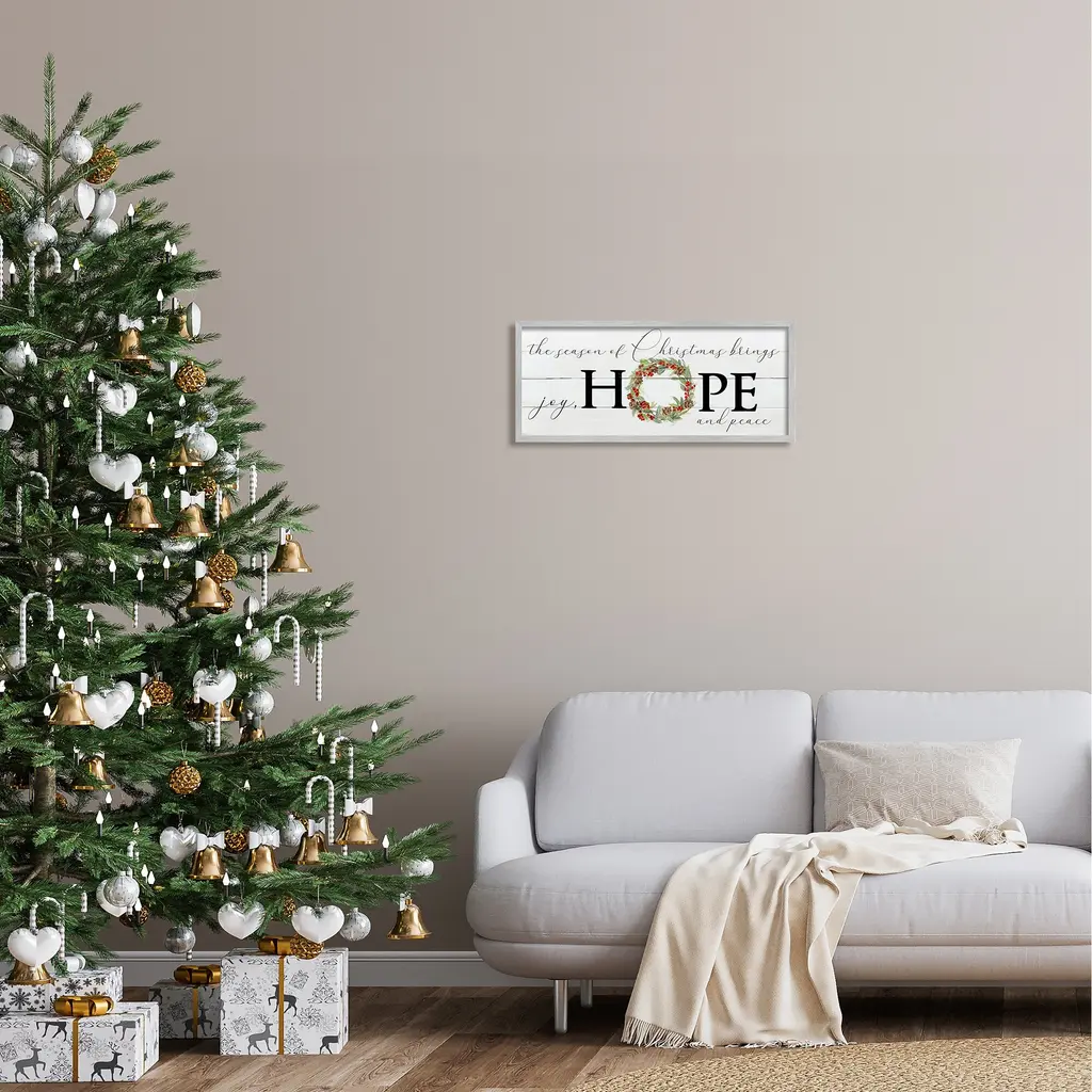Add dimension to any room with our textured Framed Giclee Artwork. Our framed artwork is securely mounted into a 1.5-inch thick wood grain frame and ready to hang. Frames are available in three alluring styles: black, gray farmhouse and white. In addition, you should check out our oversized options if you want a statement piece. Stupell Wall Art is made in the USA.Features: Dimensions: 24 x 1.5 x 10 FramedFramed Giclee Sizes Include Standard: 24 x 1.5 x 10 Oversized: 30 x 1.5 x 13Wall Art is Ready to Hang - No Installation or Hardware Needed. For Easy Set Up Lean or Layer Artwork on Shelf or Against Wall.Our giclée prints are carefully mounted on a durable MDF backing, and then perfectly finished in a 1.5 inch thick woodgrain frame. Mounted frame colors include black, gray farmhouse and white. Made In USA.Artwork Relates To: Christmas, Holiday, Holly Berry, Wreath, Plank Pattern, Farmhouse, The Season Of Christmas Brings Joy Hope And PeaceDesign by Sally Swatland