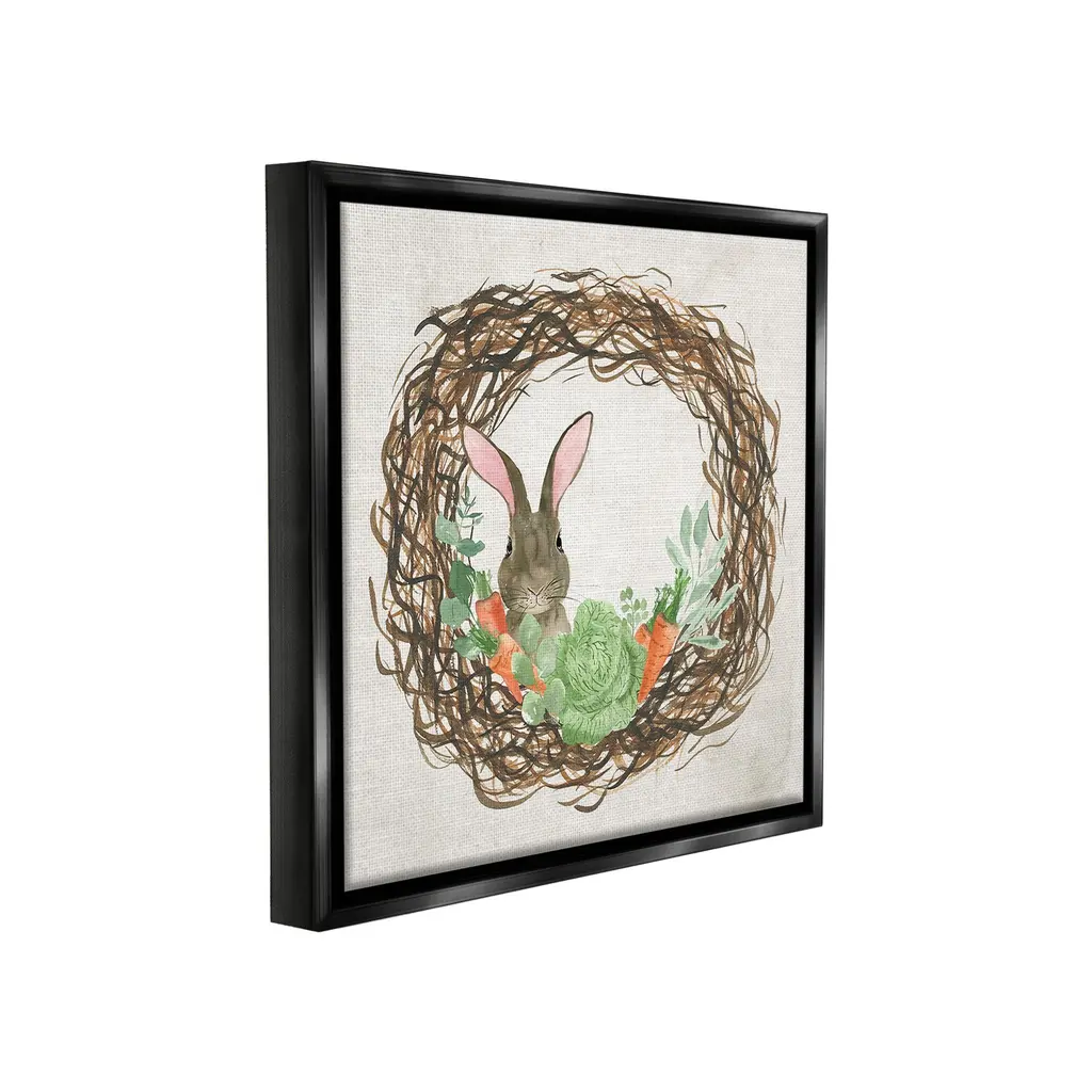 Elevate your home or office to the next level with Stupell Framed Floating Canvas Wall Art. Our premium hand-stretched canvas is mounted securely into a sturdy lightweight frame. The museum-style gap between the wrapped canvas and the box frame gives the illusion of floating artwork. Stupell Wall Art is made in the USA.Features: Dimensions: 18 x 1.7 x 18 Frame, 17 x 1.5 x 17 Canvas ArtFloating Frame Canvas Products are available in sizes 18"x18" and 25"x25". All Floating Frame Canvas Products have a 1.7" Depth.Wall Art is Ready to Hang with Hardware Free Hanging. No Installation required. For Easy Set Up Lean or Layer Artwork on Shelf or Against Wall. Artwork is Permently Fixed into the Frame.Our elevated 1.7" Thick Floating Frame is the perfect complement to our canvas style Wall Art. We use only the highest quality inks in house with industry leading printing solutions. Canvas is hand stretched over a durable wood foundation and then mounted securly into a Modern Box Frame. Made in the USA.Artwork Relates To: Animal, Mammal, Rabbit, Bunny, Hare, Wreath, Easter, Spring, Nature, Vegetables, CarrotDesign by Lucille Price