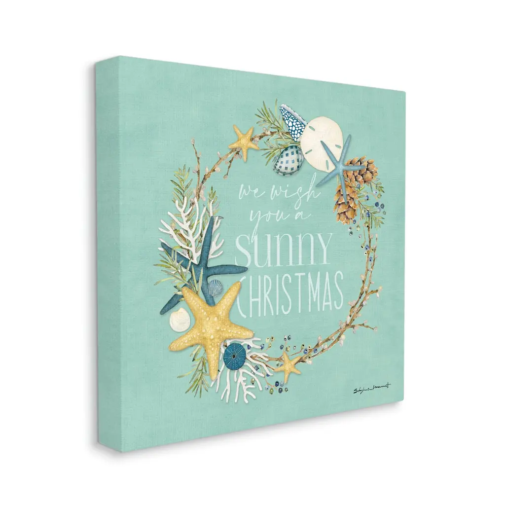 We create our stretched canvas to the highest standards. Using only the highest quality inks and canvas on Mimaki printers, we hand-cut and stretch each piece over a 1.5-inch thick wooden frame for hanging. As a result, the art comes ready to hang on the sturdy ledge with no installation required. Stupell Wall Art is made in the USA.Features: Dimensions: 17 x 1.5 x 17 InchesStretched Canvas Sizes Include Standard: 17 x 1.5 x 17 Large: 24 x 1.5 x 24 X-Large: 30 x 1.5 x 30 Oversized: 36 x 1.5 x 36Wall Art is Ready to Hang - No Installation or Hardware Needed. For Easy Set Up Lean or Layer Artwork on Shelf or Against Wall.Our stretched canvas is created with the highest standards. We use only the highest quality inks and canvas on our in house Mimaki printers, and then hand cut and stretch each piece over a 1.5 inch thick wooden frame for hanging. Made In USA.Artwork Relates To: Plant, Animal, Sea Life, Christmas, Holiday, Starfish, Coral, Wreath, Beach, Nautical, We Wish You A Sunny ChristmasDesign by Stephanie Workman Marrott