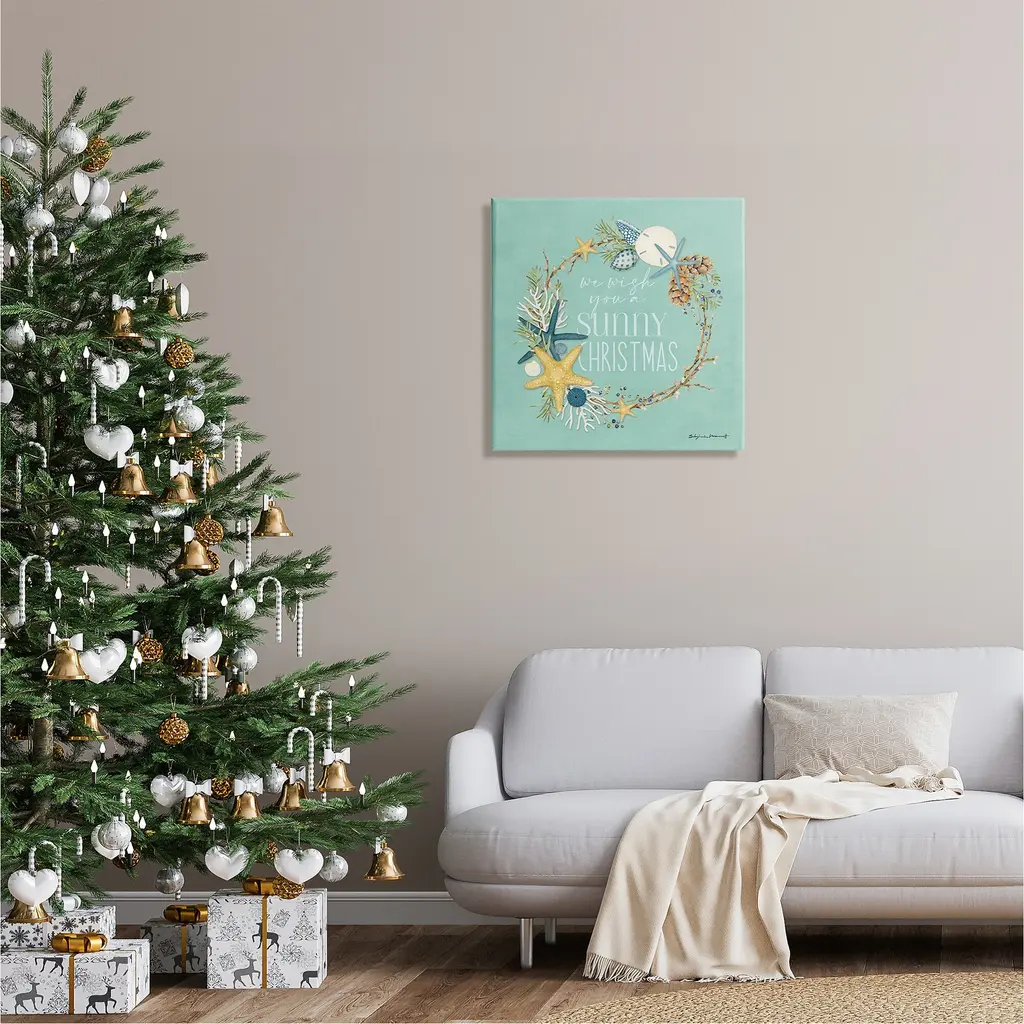 We create our stretched canvas to the highest standards. Using only the highest quality inks and canvas on Mimaki printers, we hand-cut and stretch each piece over a 1.5-inch thick wooden frame for hanging. As a result, the art comes ready to hang on the sturdy ledge with no installation required. Stupell Wall Art is made in the USA.Features: Dimensions: 17 x 1.5 x 17 InchesStretched Canvas Sizes Include Standard: 17 x 1.5 x 17 Large: 24 x 1.5 x 24 X-Large: 30 x 1.5 x 30 Oversized: 36 x 1.5 x 36Wall Art is Ready to Hang - No Installation or Hardware Needed. For Easy Set Up Lean or Layer Artwork on Shelf or Against Wall.Our stretched canvas is created with the highest standards. We use only the highest quality inks and canvas on our in house Mimaki printers, and then hand cut and stretch each piece over a 1.5 inch thick wooden frame for hanging. Made In USA.Artwork Relates To: Plant, Animal, Sea Life, Christmas, Holiday, Starfish, Coral, Wreath, Beach, Nautical, We Wish You A Sunny ChristmasDesign by Stephanie Workman Marrott
