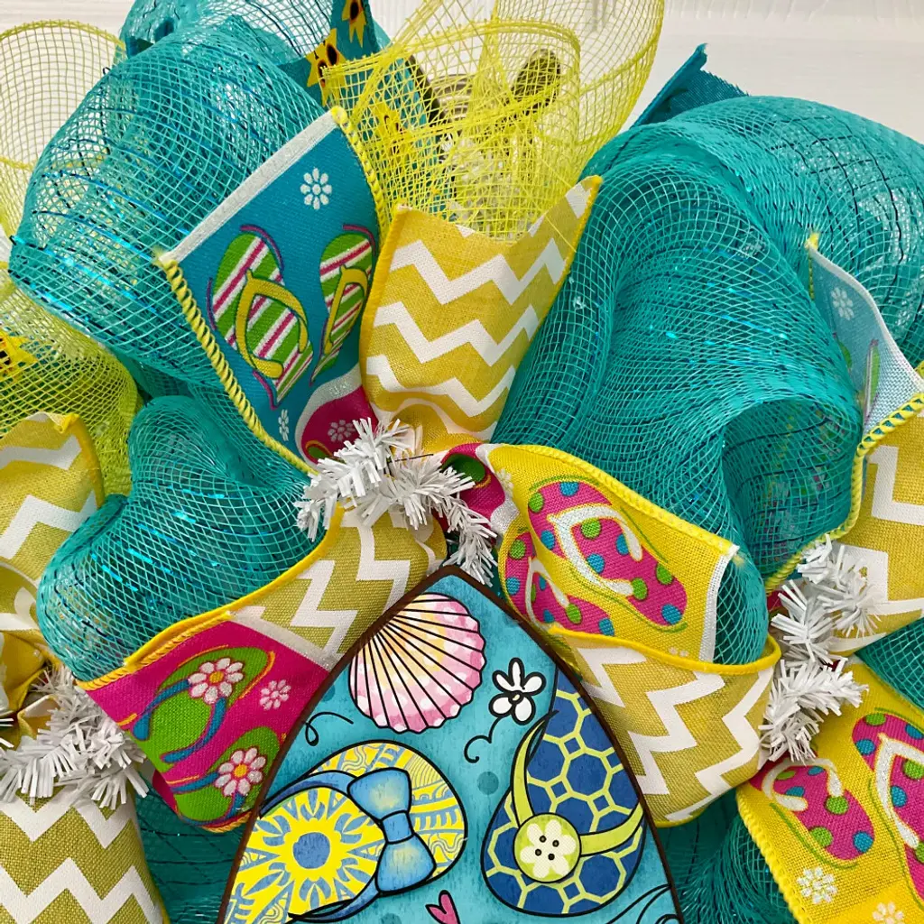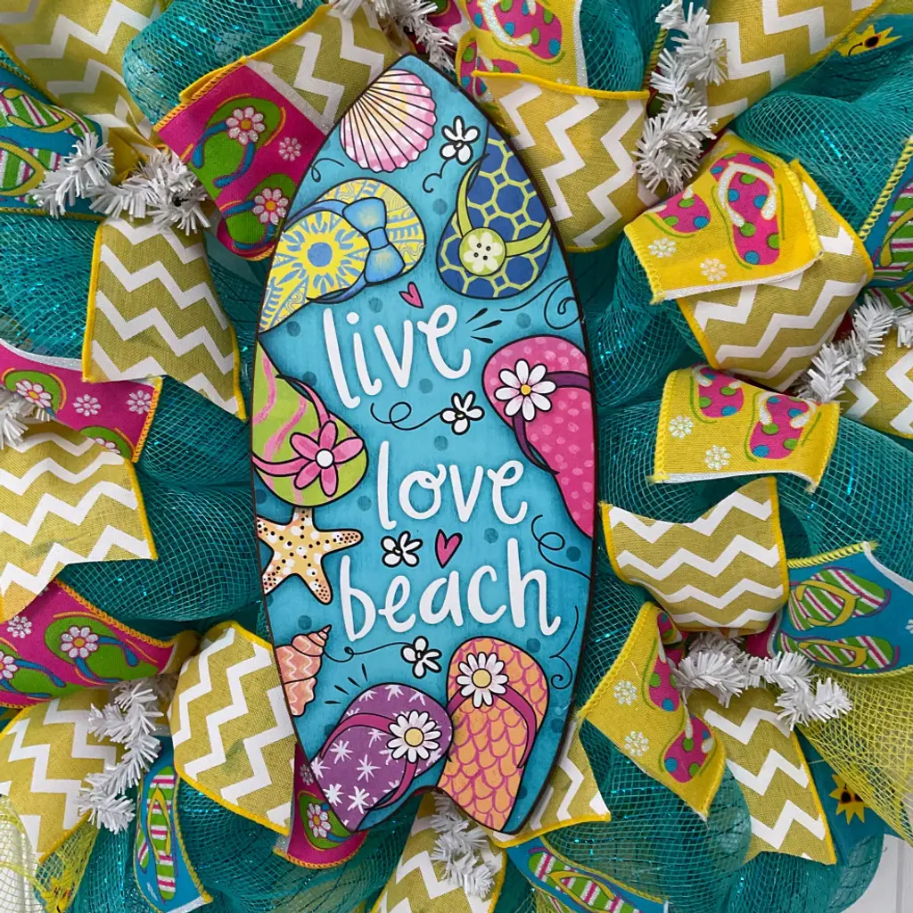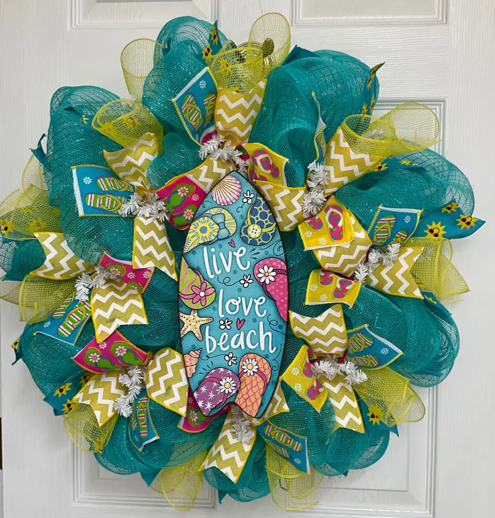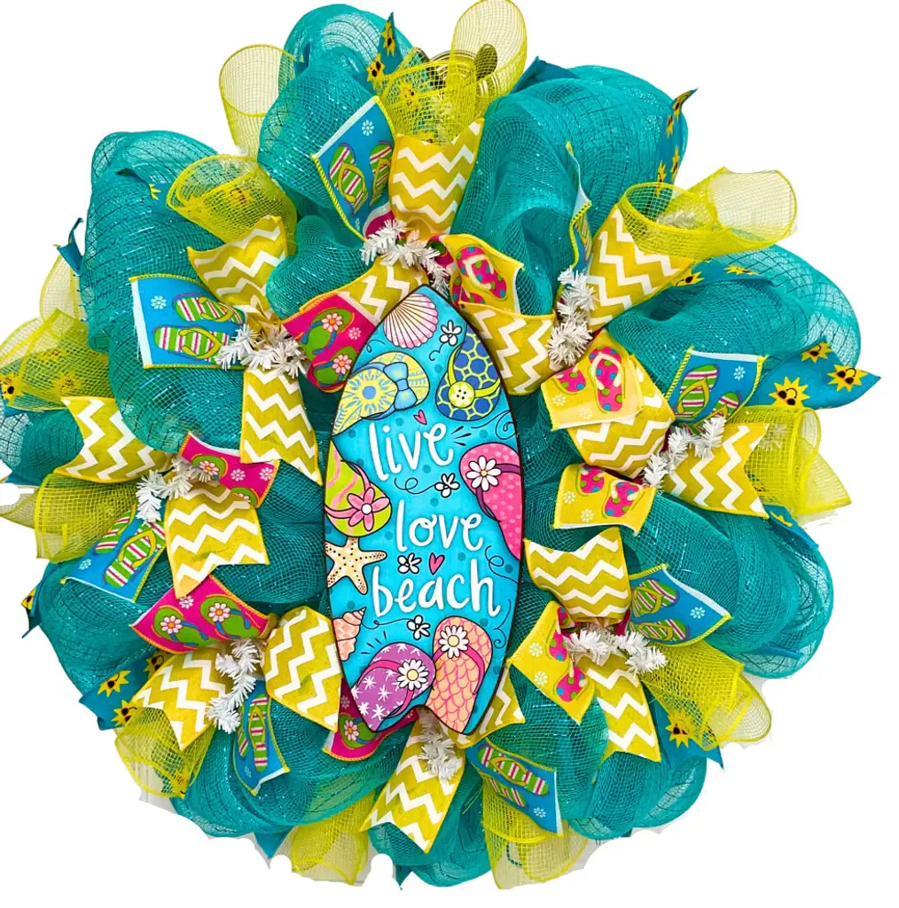 Full! Premium! Large, Handmade Deco Mesh Summer Wreath. Gorgeous, wood surf board sign with white lettering, live love beach, rests on a bed of shimmering turquoise deco mesh. The sign is decorated with shells, starfish and flip flops. The inner ring has premium yellow and white chevron ribbon and adorable flip flop ribbon. The outer ring has yellow deco mesh flutes and adorable smiling sun ribbons with glasses.. Perfect for pools, tiki bars, patios, screen porches or doors. Size is available in 24 and 28 inch diameters and 6 inches deep.