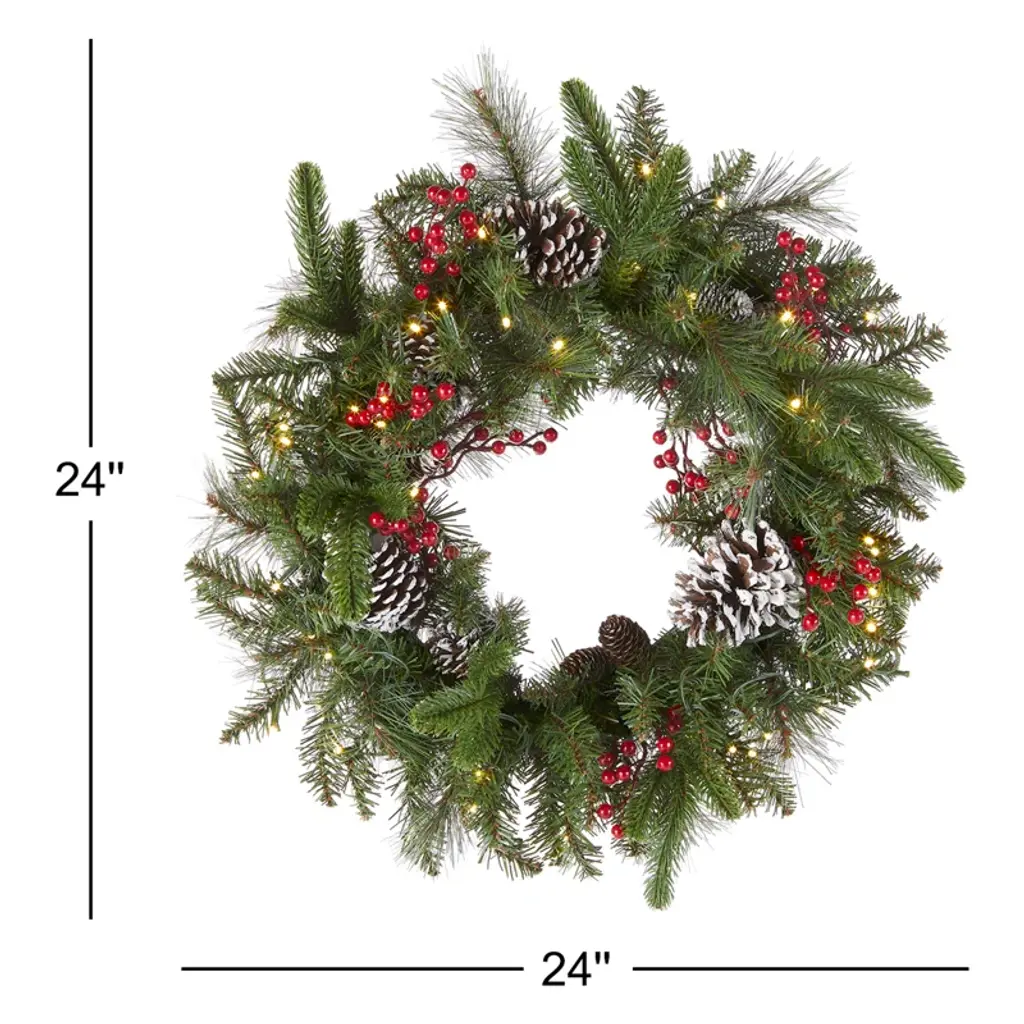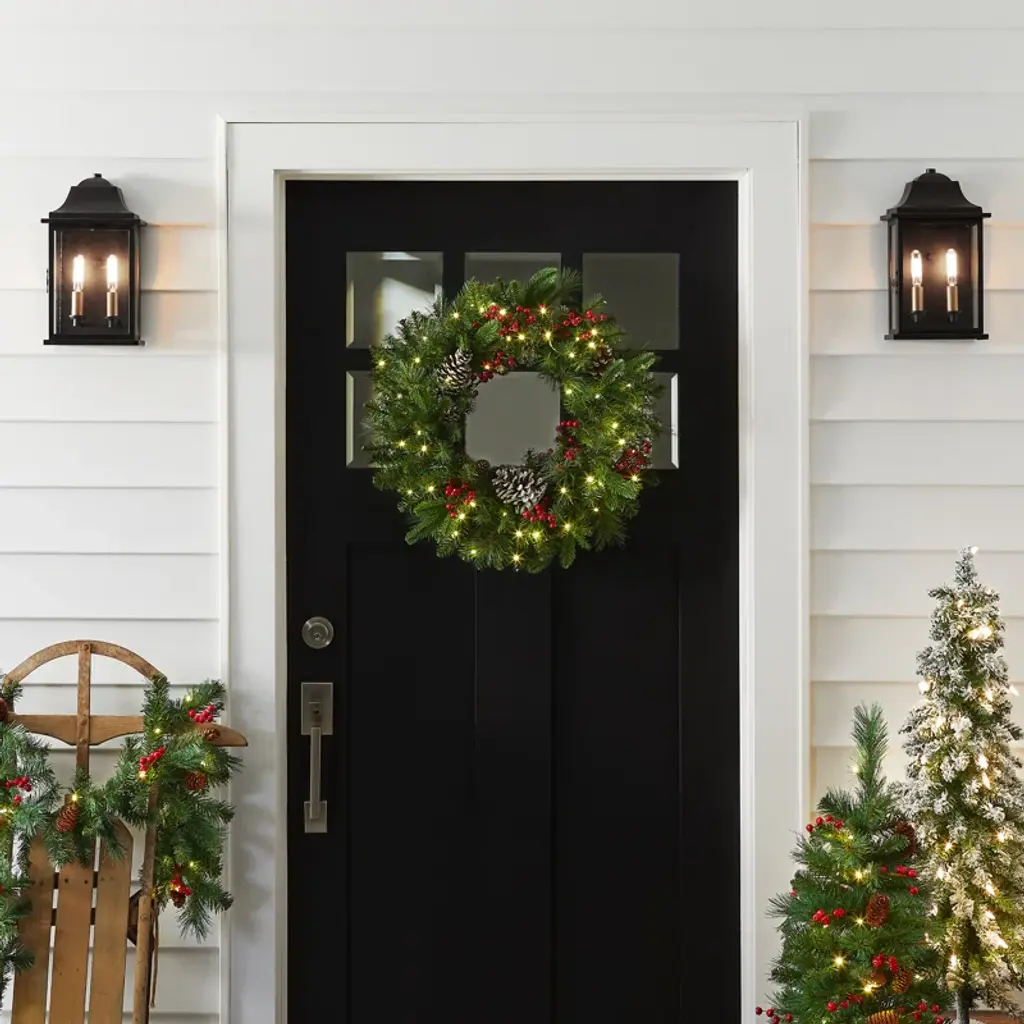 This Bristle Berry wreath features Feel Real® branch tip technology, creating a decoration with remarkable realism. This mixed evergreen tip wreath is trimmed with red berries and pine cones. It is pre-strung with 50 battery-operated warm white LED lights that are energy-efficient and long lasting. 6 hours ON/18 hours OFF timed operation. This wreath can be displayed on doors, walls and windows in indoor or covered outdoor locations.