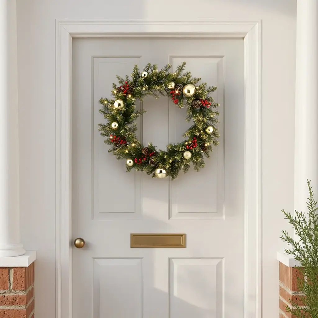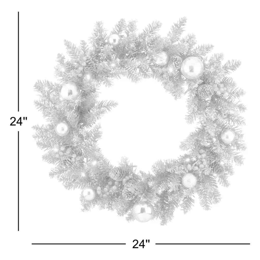 This product features snow-sprinkled branch tips trimmed with red berries, pinecones, and glossy gold ball ornaments. It is pre-strung with 35 battery-operated warm white LED lights that are energy-efficient and long-lasting. 6 Hours ON/18 hours off timed operation. This attractive wreath can be displayed on doors, walls, and windows in indoor or outdoor locations.