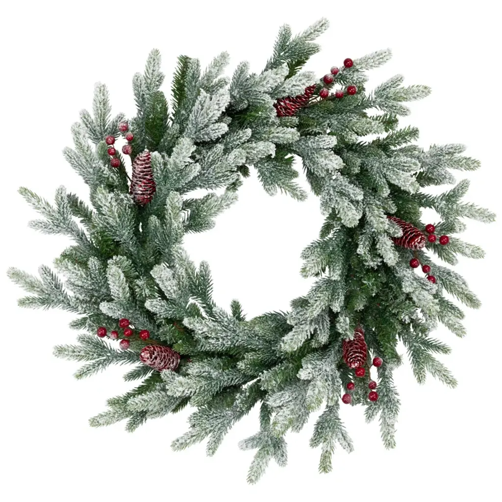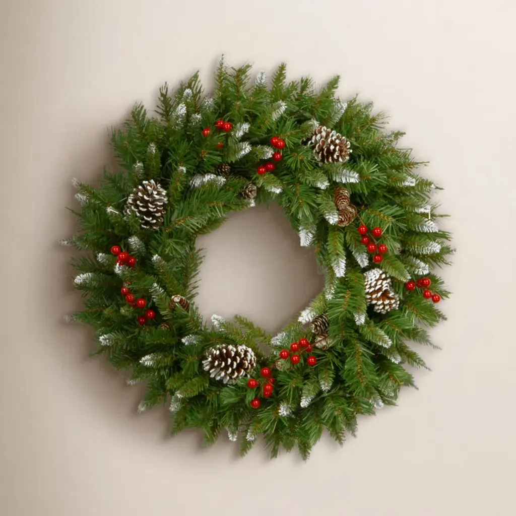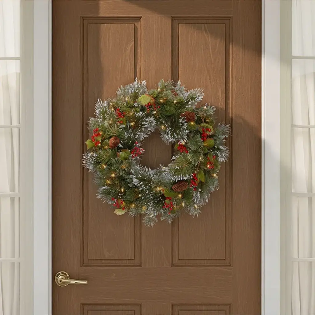 This 2' wide faux pine wreath is just what your doorway or window needs for the holiday season. It features a mixed assortment of branch tips that are trimmed with red berries, pine cones, holly leaves, and a dusting of snowflakes for a wintry look. But that's not all – this artificial wreath is also pre-strung with 50 battery-operated warm white LED lights. These energy-efficient lights are energy-efficient and long-lasting, and feature 6 hours on/18 hours off timed operation so you don't have to worry about turning them on.