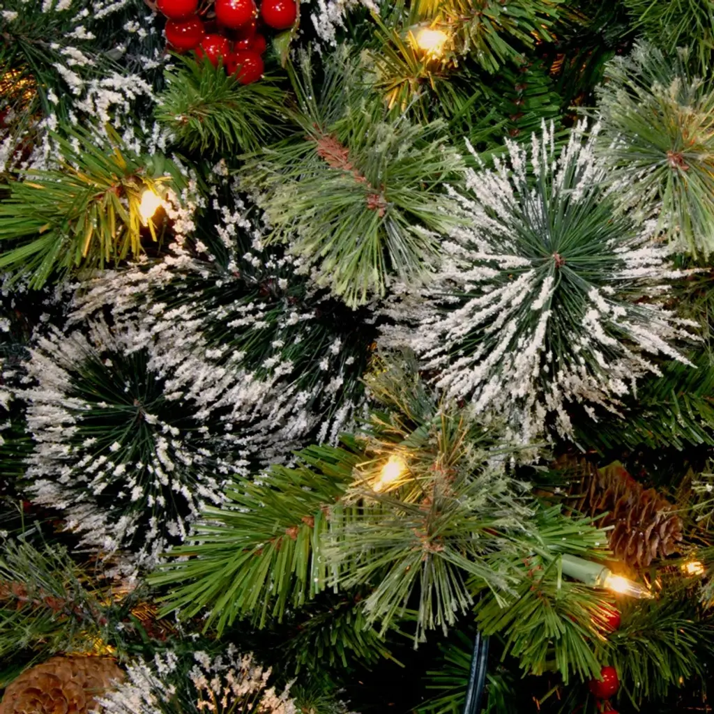 This wide faux pine wreath is just what your doorway or window needs for the holiday season. It features a mixed assortment of branch tips that are trimmed with red berries, pine cones, holly leaves, and a dusting of snowflakes for a wintry look. But that's not all – this artificial wreath is also pre-strung with battery-operated warm white LED lights. These energy-efficient lights are energy-efficient and long-lasting, and feature 6 hours on/18 hours off timed operation so you don't have to worry about turning them on.