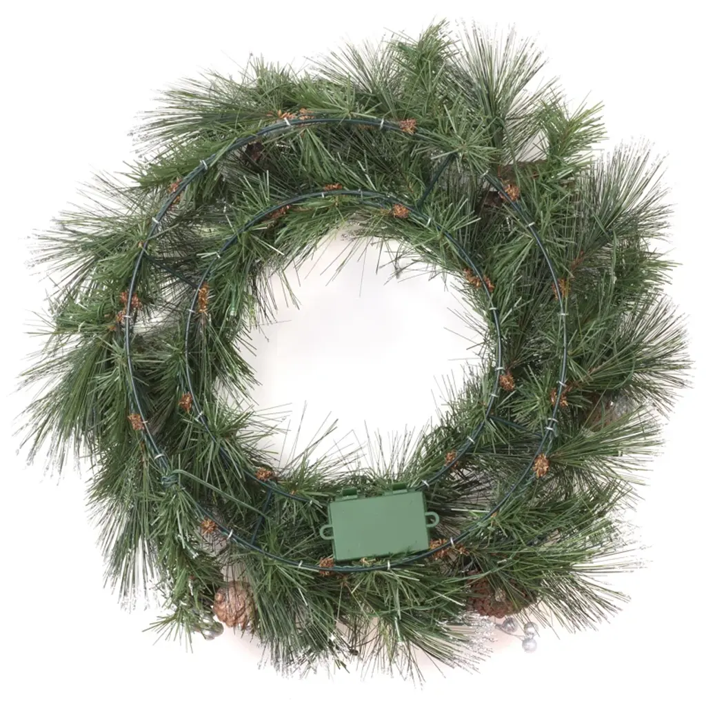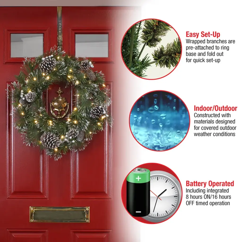 This attractive wreath features a mixture of evergreen and bristle branch tips trimmed with glitter, snow-dusted pinecones and white berries. It is pre-strung with 50 battery-operated warm white LED lights that are energy-efficient and long lasting. Included is an option for 6 hours ON/18 hours OFF timed operation. This holiday wreath can be displayed on doors, walls, and windows in indoor or covered outdoor locations.