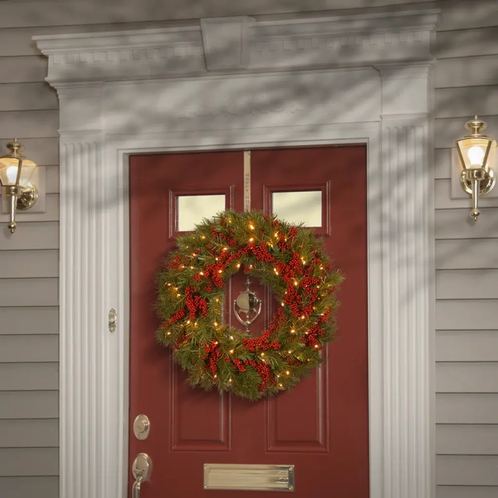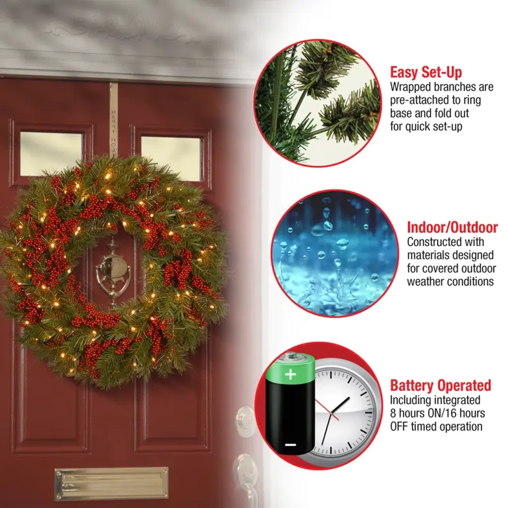 This pine wreath is part of this collection line of holiday decorating ideas. This thick green wreath is color offset with clusters of bright red berries. It is pre-strung with 50 battery-operated warm white LED lights that are energy-efficient and long lasting. 6 hours on/18 hours off timed operation.