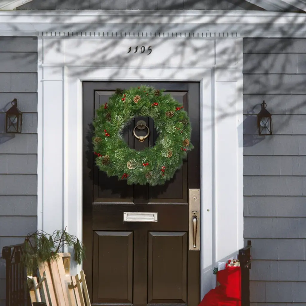 This Christmas-style twig wreath brings a touch of holiday color and woodland style to your space. Handcrafted with artificial materials, this holiday wreath creates the look of real foliage with boughs of pine scattered with pine cones and red holly berries. Plus, it has a slight dusting of flocking on the tips of the branches for just a hint of snow. We love that its design makes its orientation reversible. Measuring 30'' in diameter, this wreath works on any door, wall, or even over your fireplace.