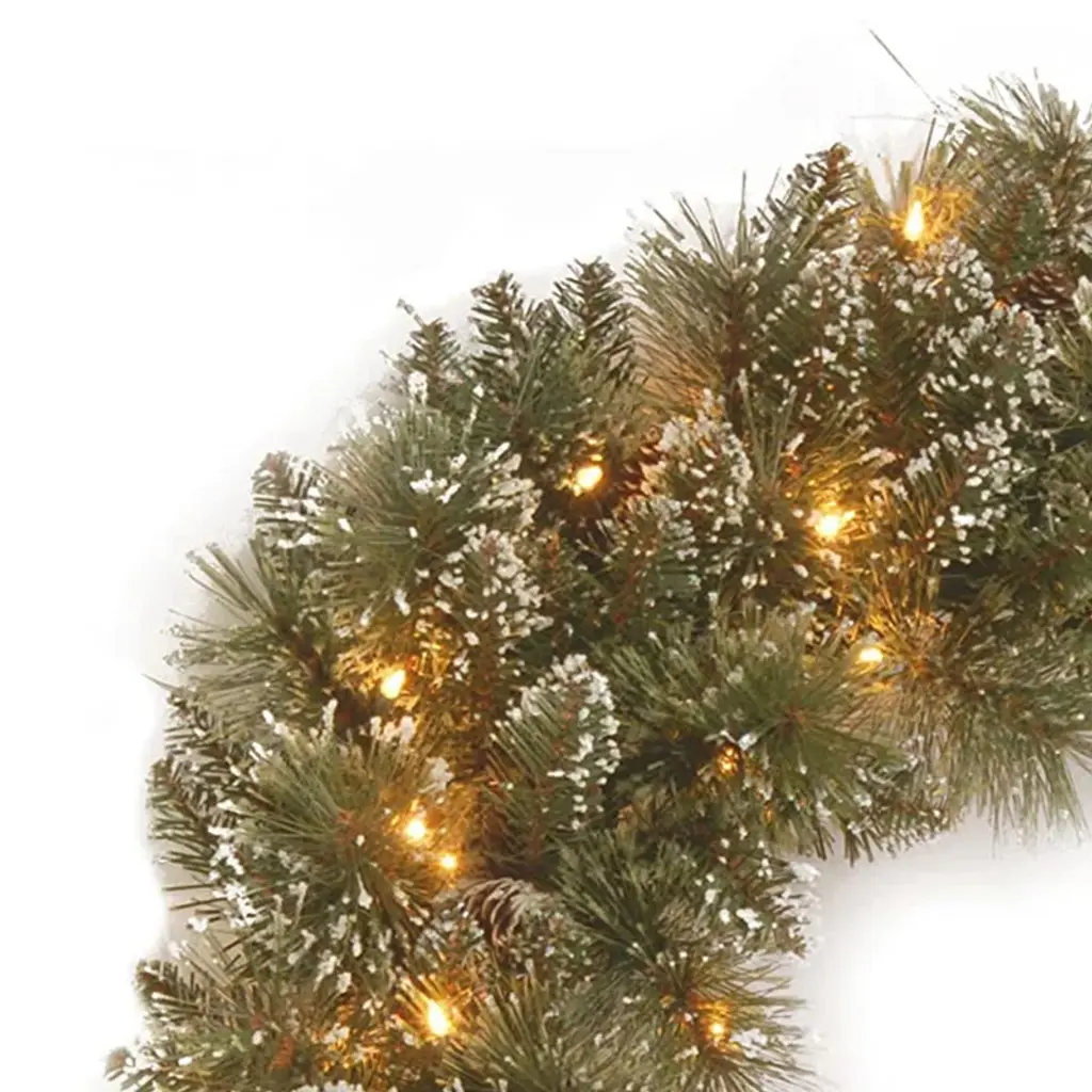 Frosty elegance awaits! This pre-lit wreath brings the winter holidays to life with frosted branches and pine cones adorning a circle-shaped base. Strung with LED lights for a warm glow, it's perfect for both indoor and covered outdoor spaces. The realistic, crush-resistant polyethylene tips create a full-bodied look, while the hypoallergenic, fire-resistant needles ensure long-lasting cheer. Enjoy the festive ambiance it brings to doors, windows, or mantels season after season.
