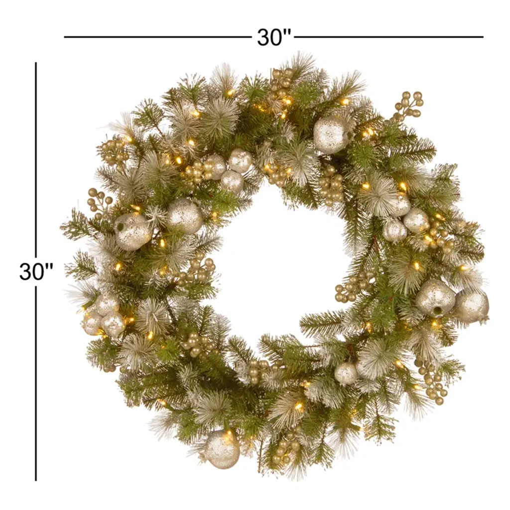 This artificial pine wreath adds a glam, modern look to your collection of Christmas decorations, and is perfect for accenting covered outdoor or indoor locations. This wreath features snow-tipped branches and is accented with clusters of gold berries and glittered pomegranate fruit. Plus, it is pre-strung with battery-operated warm white LED lights for an energy-efficient glow. It's easy to set up with a timer for 6 hours of light and 18 hours without, so you don't have to worry about turning it on and off! Please note that since this wreath features glitter, shedding is likely.