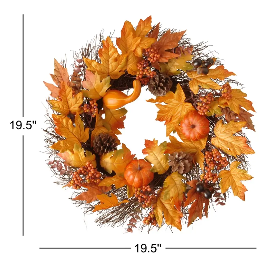 This wreath features assorted maple leaves in bright fall colors flowing from a woven branch base with individual twigs spread out from the center. It is trimmed with orange gourds, pinecones, acorns, and berry clusters for added natural appeal. Display this autumn accented wreath on doors, walls, and windows in indoor or covered outdoor locations.