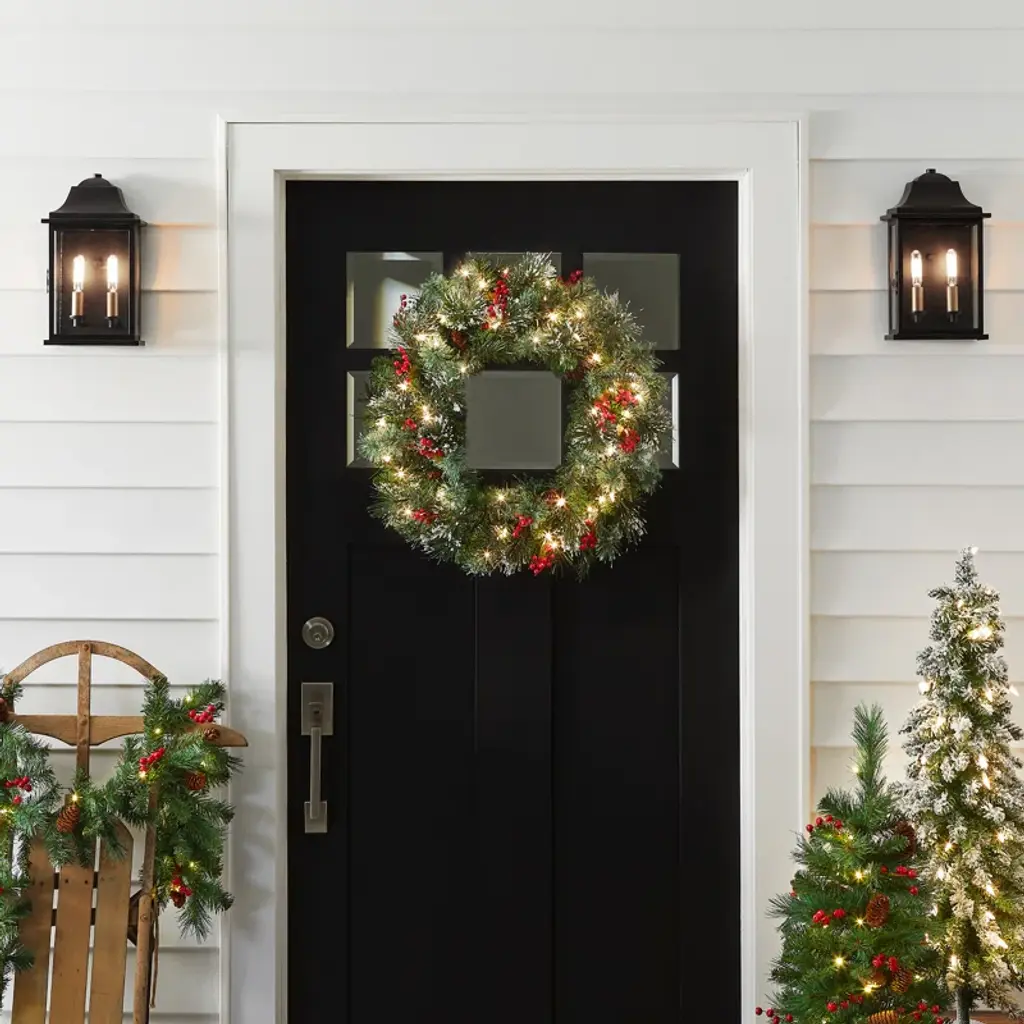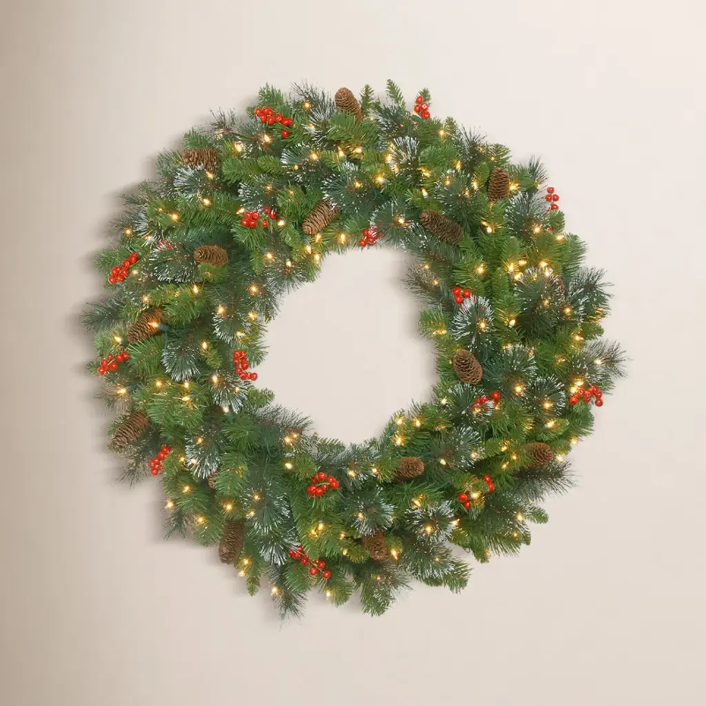 The Wintry Pine wreath features mixed branch tips trimmed with red berries, pine cones, holly leaves, and snowflakes. It is pre-strung with warm white incandescent lights that remain lit even if a bulb burns out. This wreath can be displayed on doors, walls, and windows in indoor or covered outdoor locations.