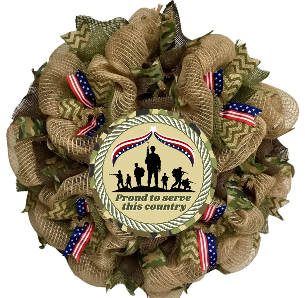 Full, Premium Deco Mesh Patiotic Wreath. Three rustic, weathered, hearts rest on a bed of white deco mesh. The sign has the word Welcome on the top of the three wood hearts. The inner ring has burlap and red striped ribbons and navy blue canvas ribbons The outer ring is made of beautiful navy blue deco mesh with burlap lines. Red loose burlap and navy blue star ribbons surround the exterior. Size is availble in 24 inch or 28 inch diameters. Both are 6 inches deep.